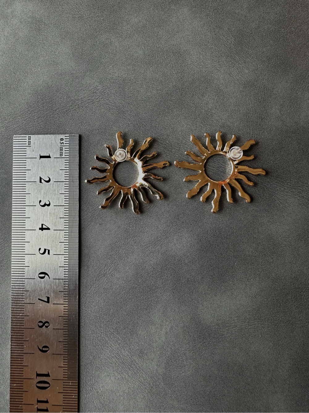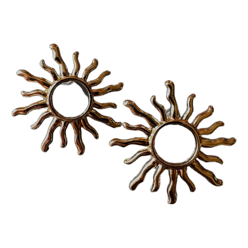 Gold-toned stud earrings shaped like a sun. Includes transparent earring backs.