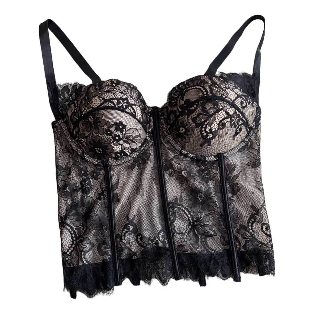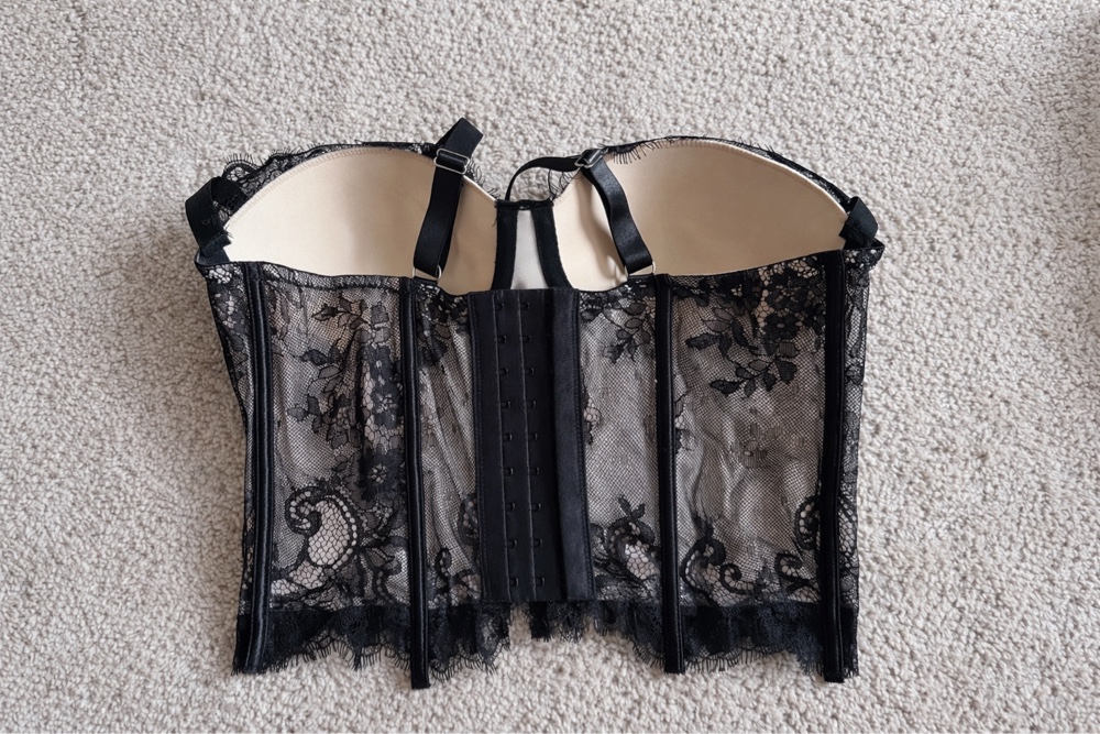 Black lace corset top with structured bodice and hook-and-eye back closure. Features adjustable shoulder straps.