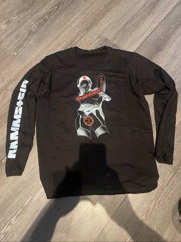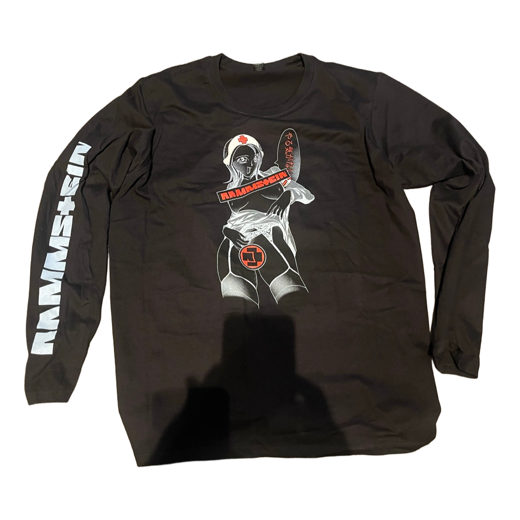Black Rammstein-themed long-sleeved shirt with a graphic print on the front and text on the sleeve.