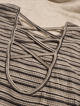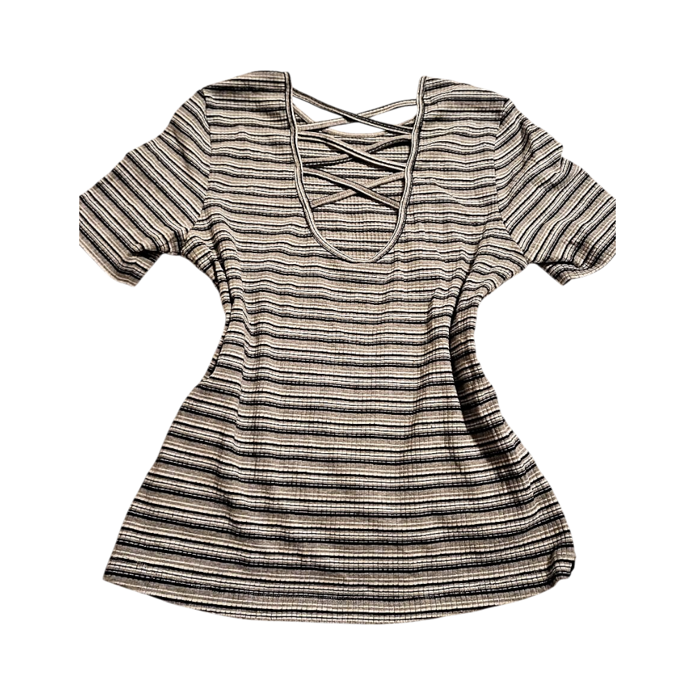 Grey striped shirt, short sleeves and crisscross-patterned neckline. Comfortable material, suitable for everyday.