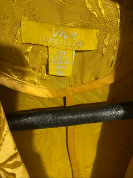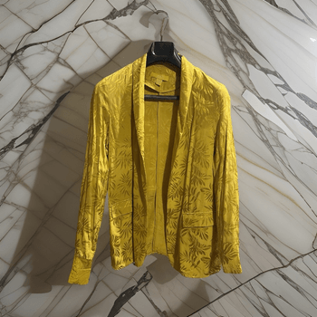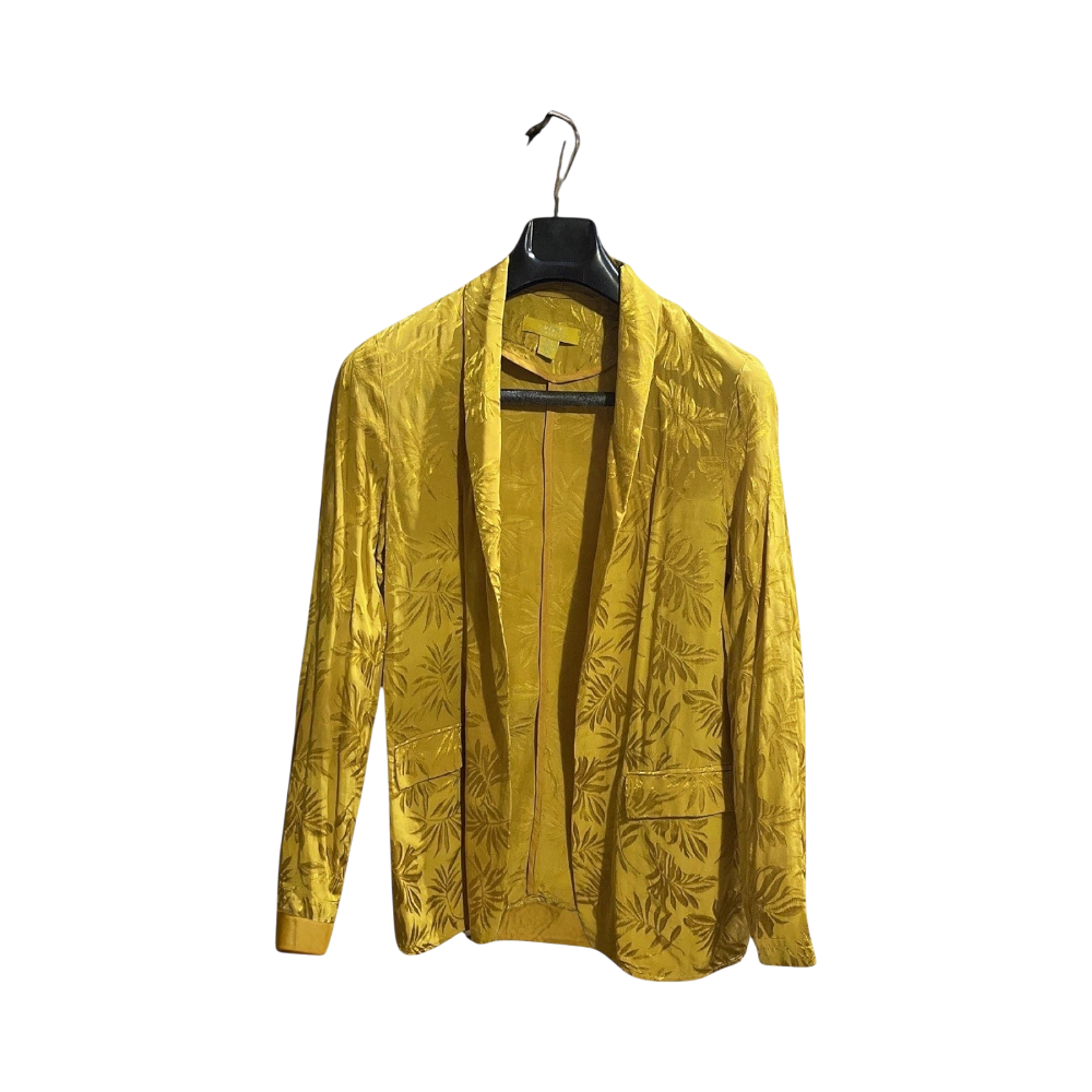 Blazer featuring a bright yellow color with floral patterns. Includes an open front design and two front pockets.