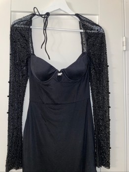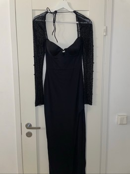 Black long evening gown with a slit and long decorated sleeves.