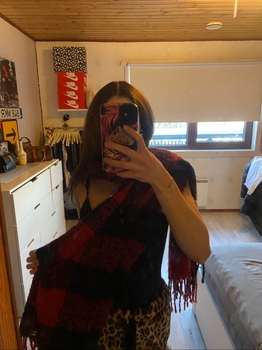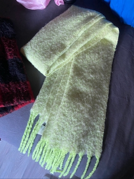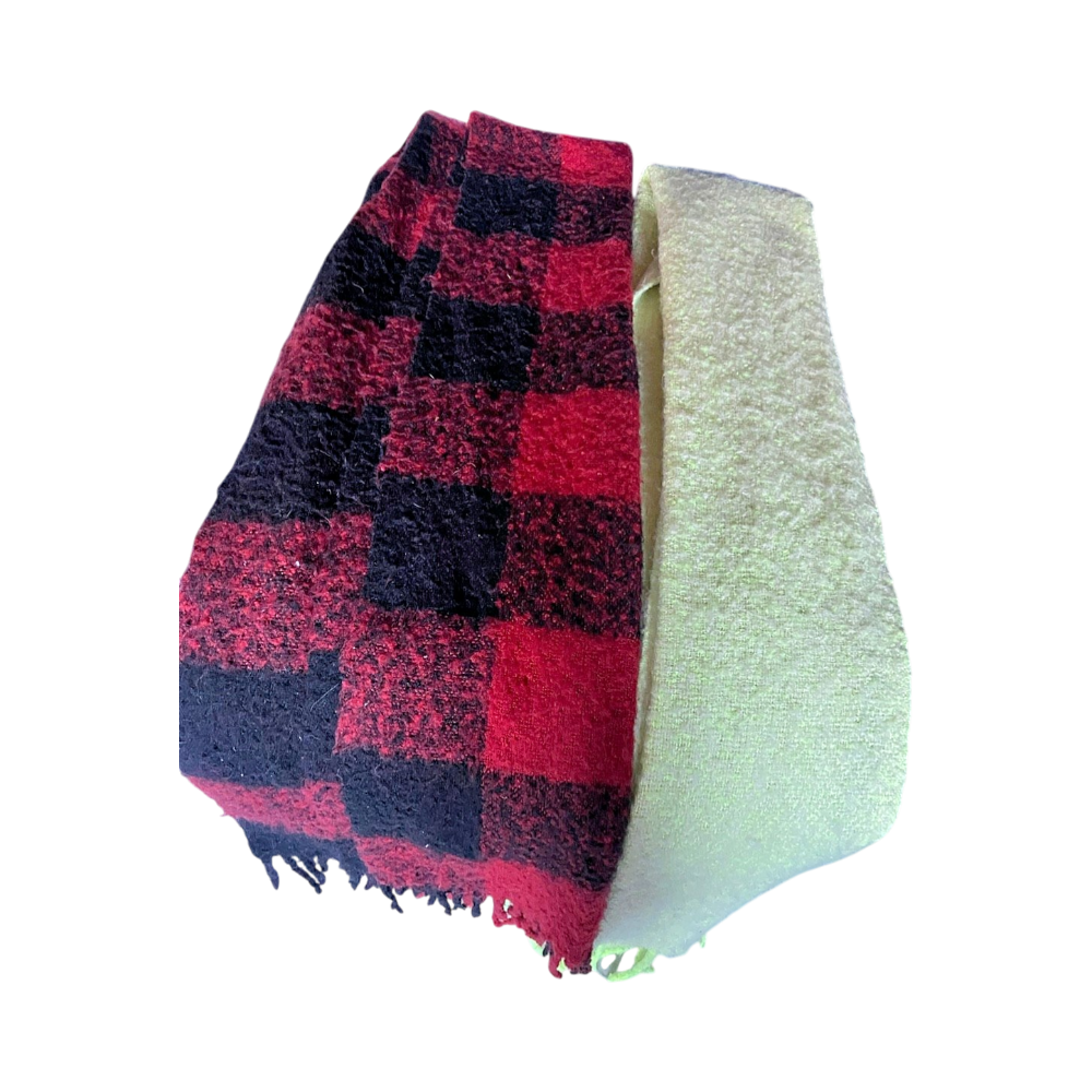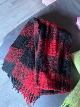 Red and black checkered scarf with fringes and neon green scarf. The scarf is made of thick and fluffy material. 2 pcs