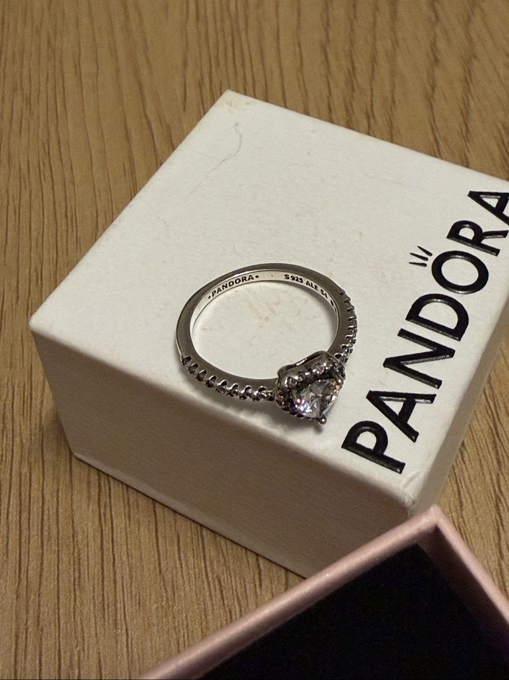 Silver heart-shaped ring with stone detailing. Comes without Pandora box. Size 54.
