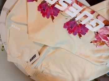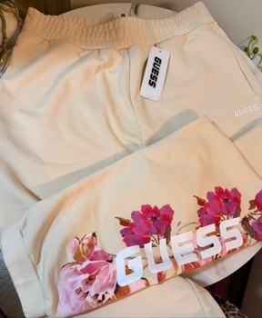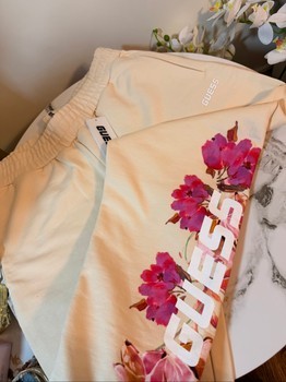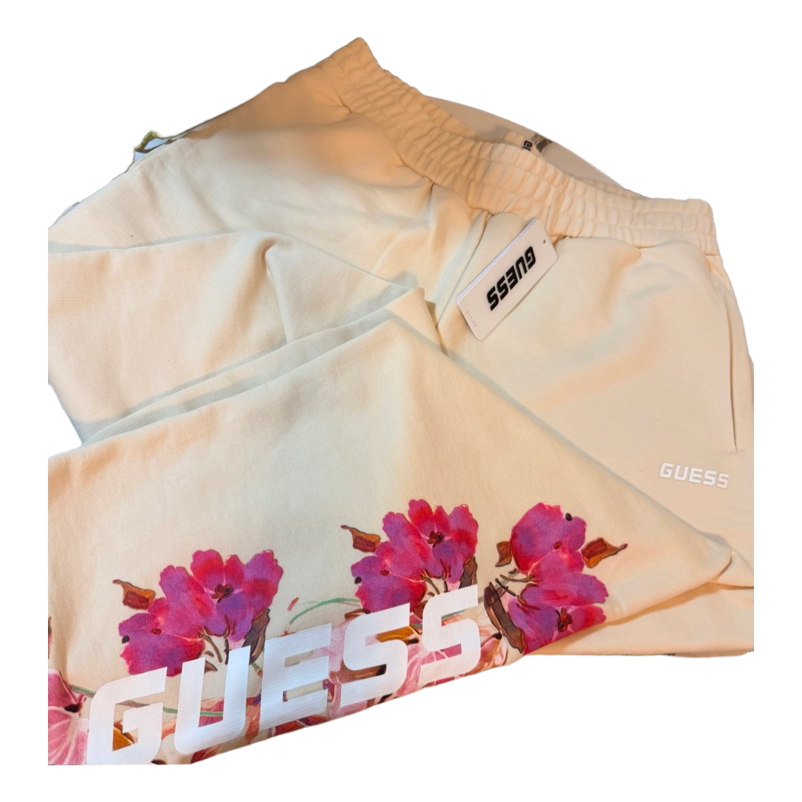 Beige sweatpants with a floral pattern and Guess branding. Elastic waistband and side pockets. New with tags, size XL.