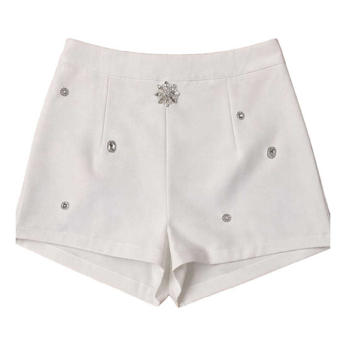 White tailored shorts adorned with scattered rhinestone embellishments. Features a high-waist fit.