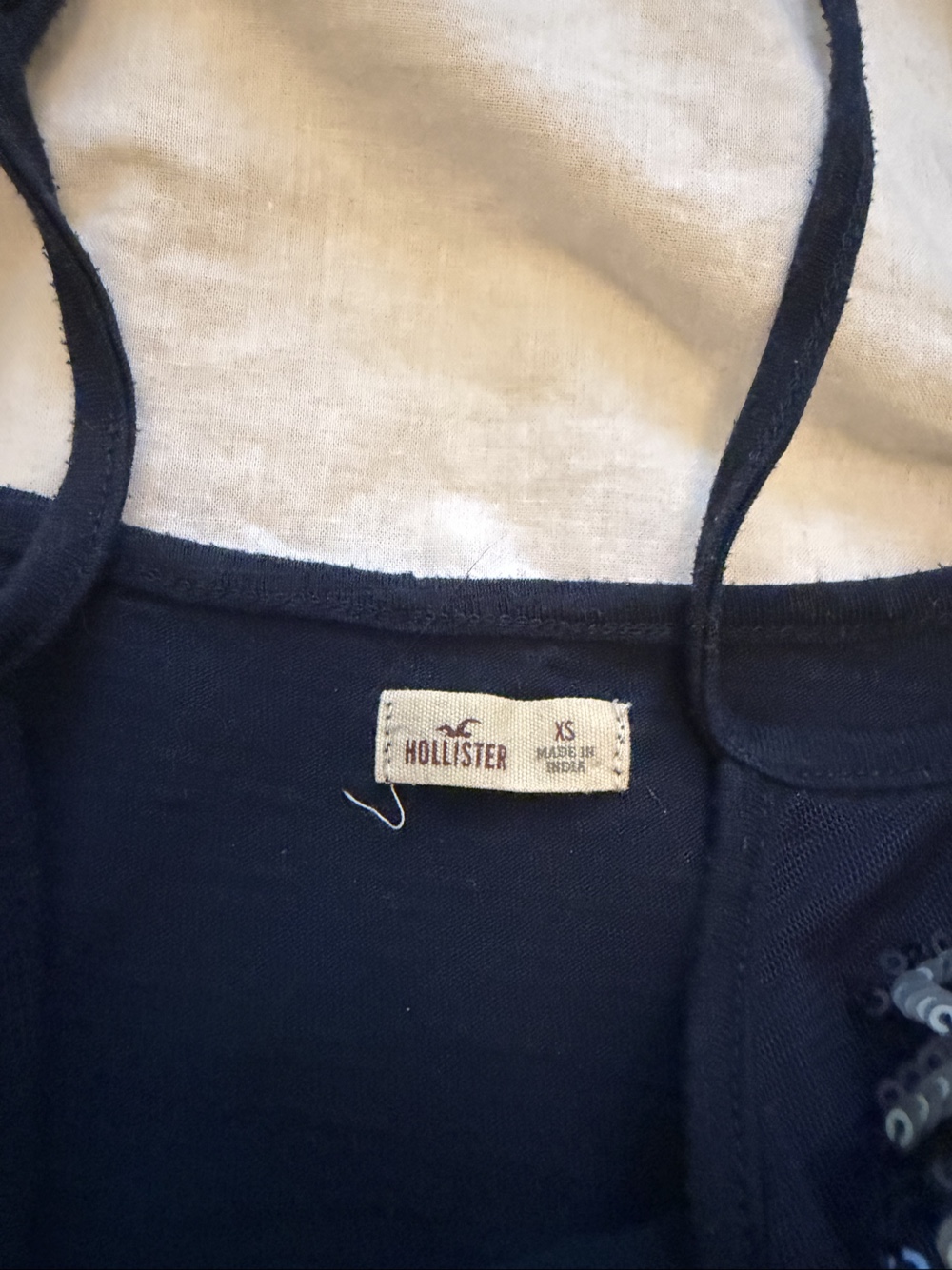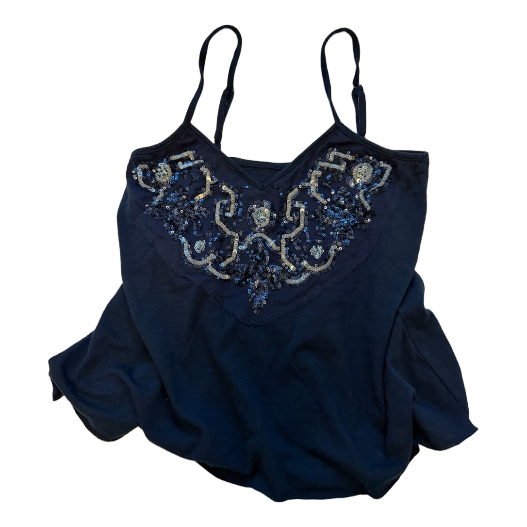 Navy camisole top featuring silver sequin embellishments on the neckline. Adjustable spaghetti straps, size XS.