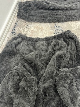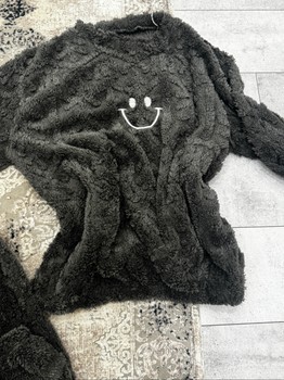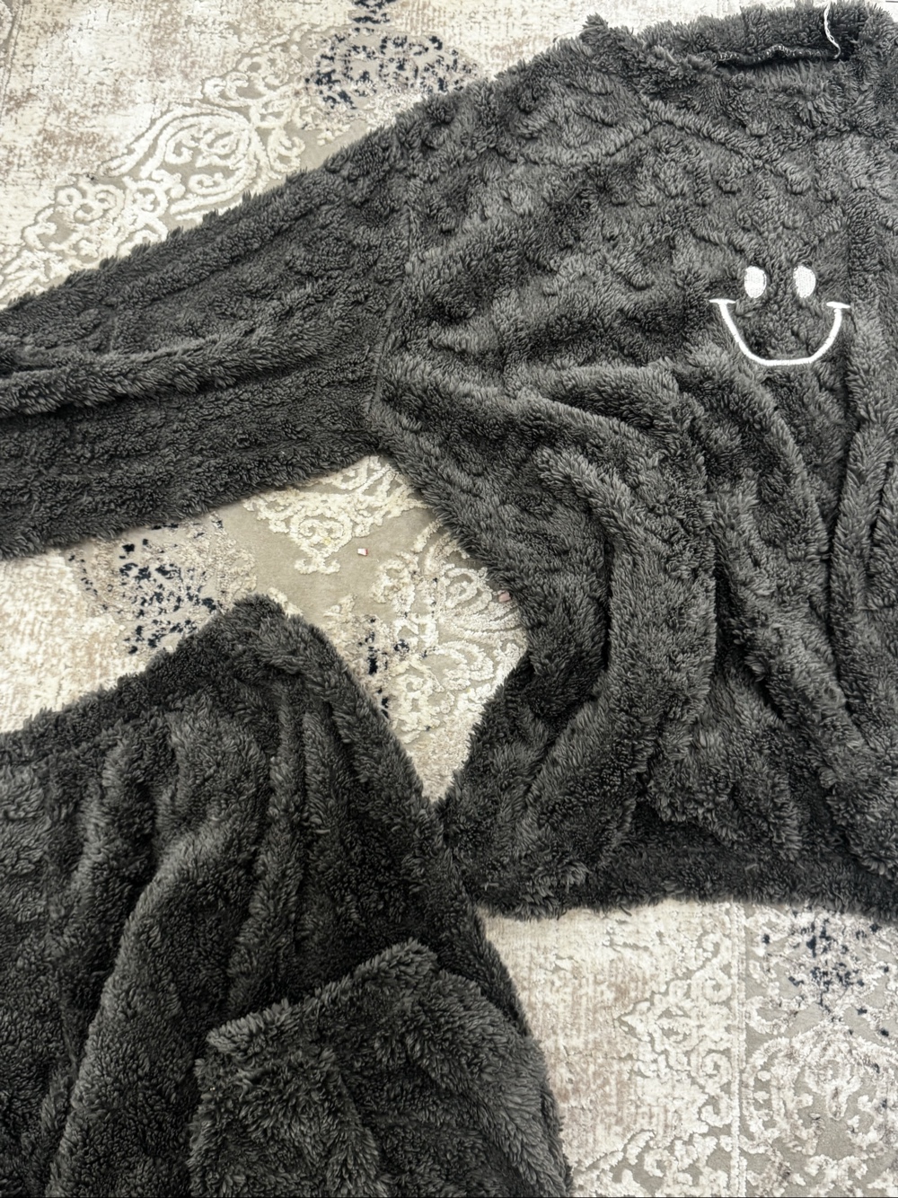 Matching grey fleece lounge set featuring a soft, textured fabric and a smiley face detail on the top.