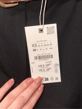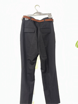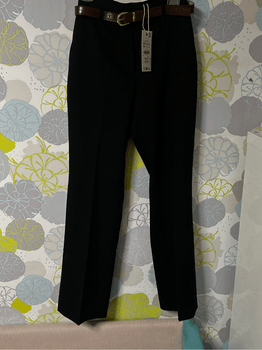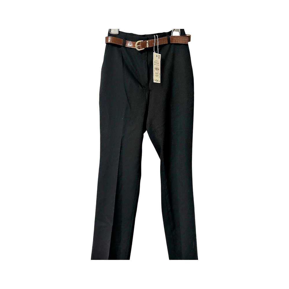 Black tailored trousers with a brown belt. Features pockets and a slim fit design. Size XS, with tags attached.
