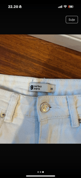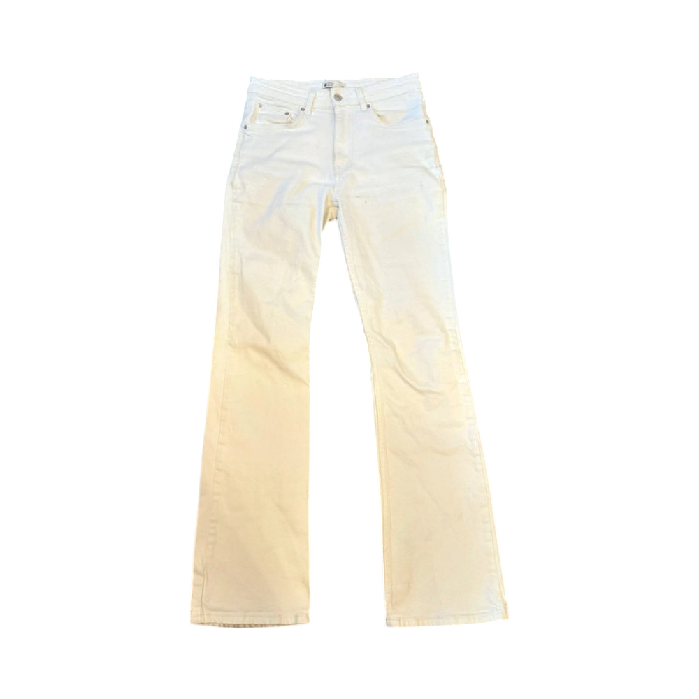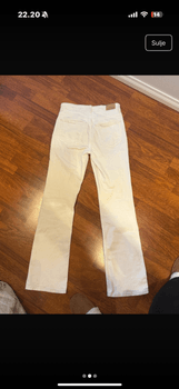 Used white jeans but only slight signs of wear, a couple of makeup stains at the front top that did not come out in the wash, the lighting is deceptive and the trousers look yellowish but are white.