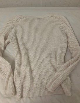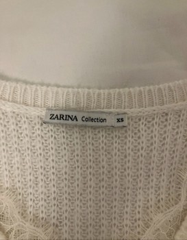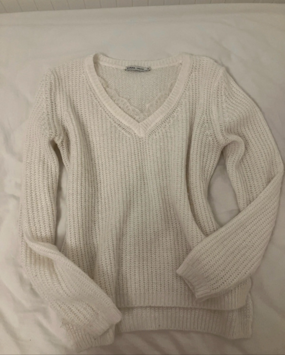 White knit jumper with lace trim detail at the V-neckline. Size XS.