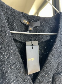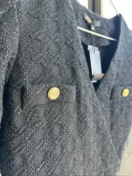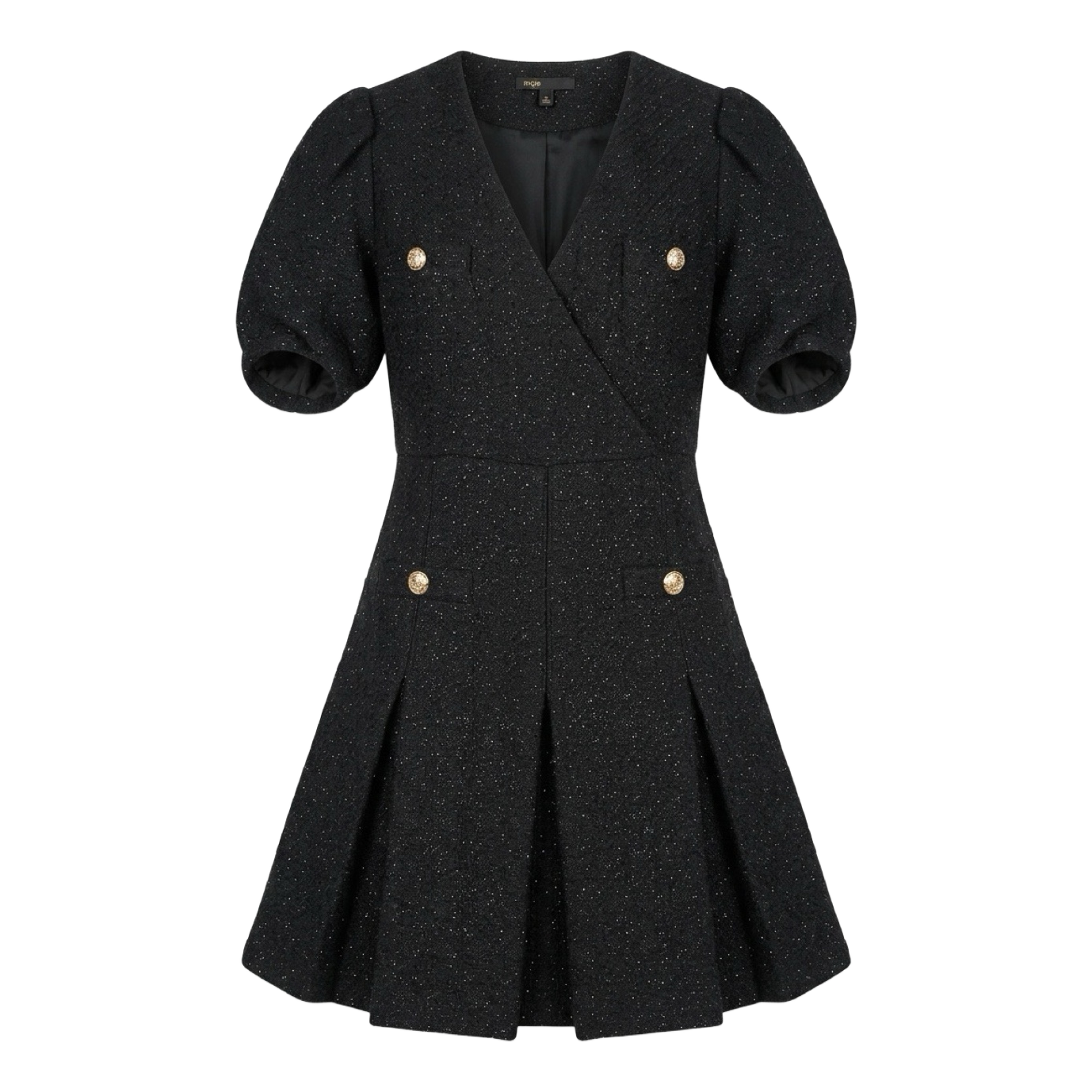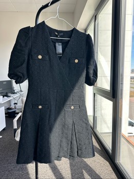 Black textured mini dress by Maje with gold-tone buttons and pleated skirt details. Size 38.