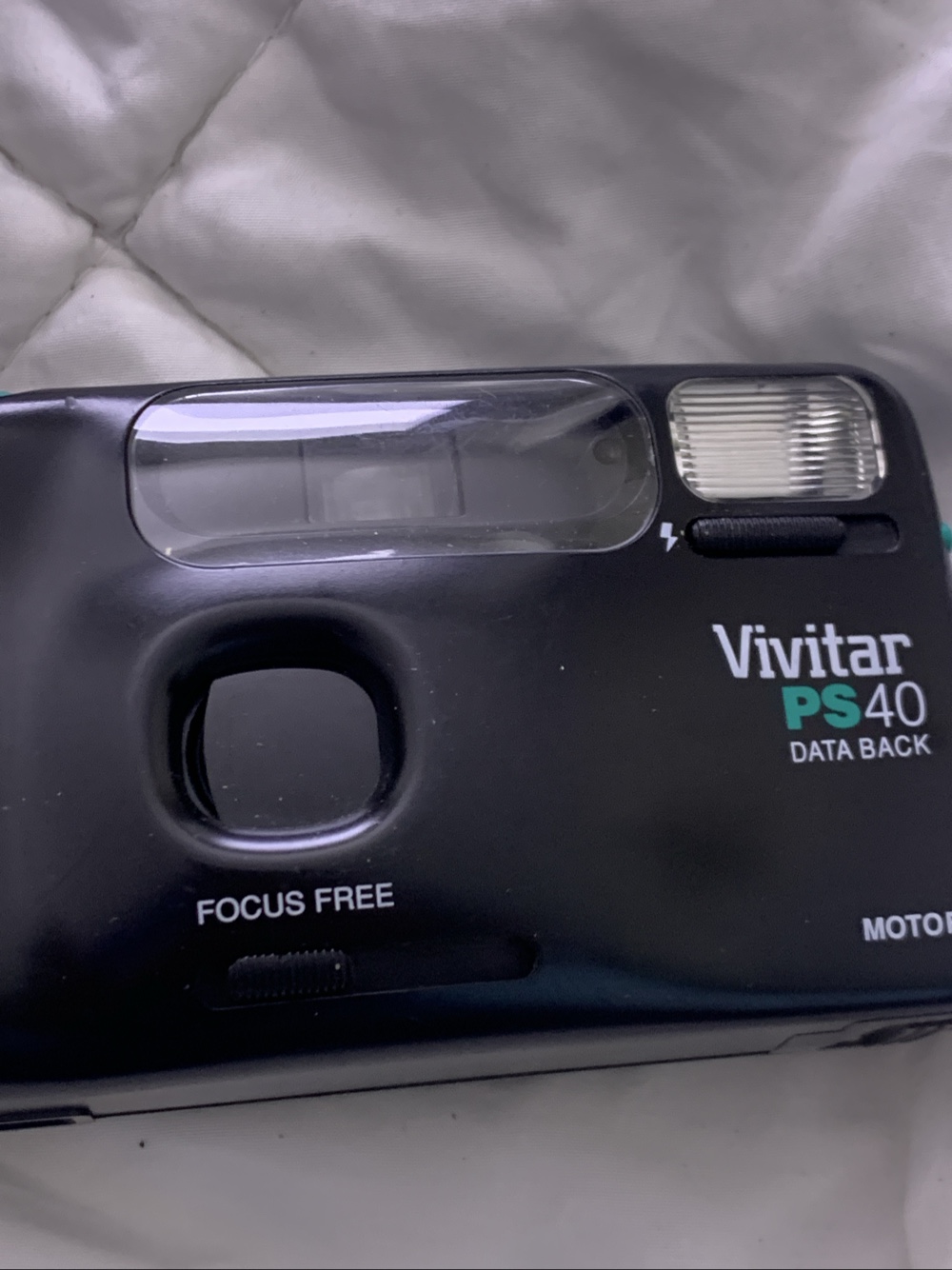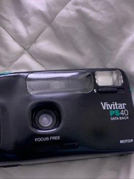 Black Vivitar PS40 film camera. Includes flash and motor.