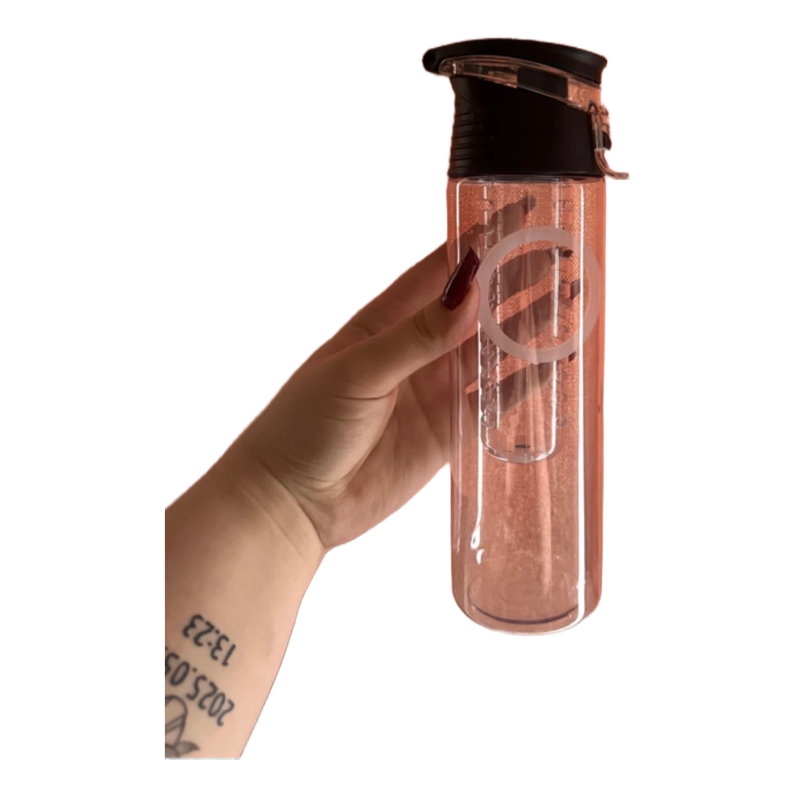 Clear water bottle with black lid and internal infuser chamber.