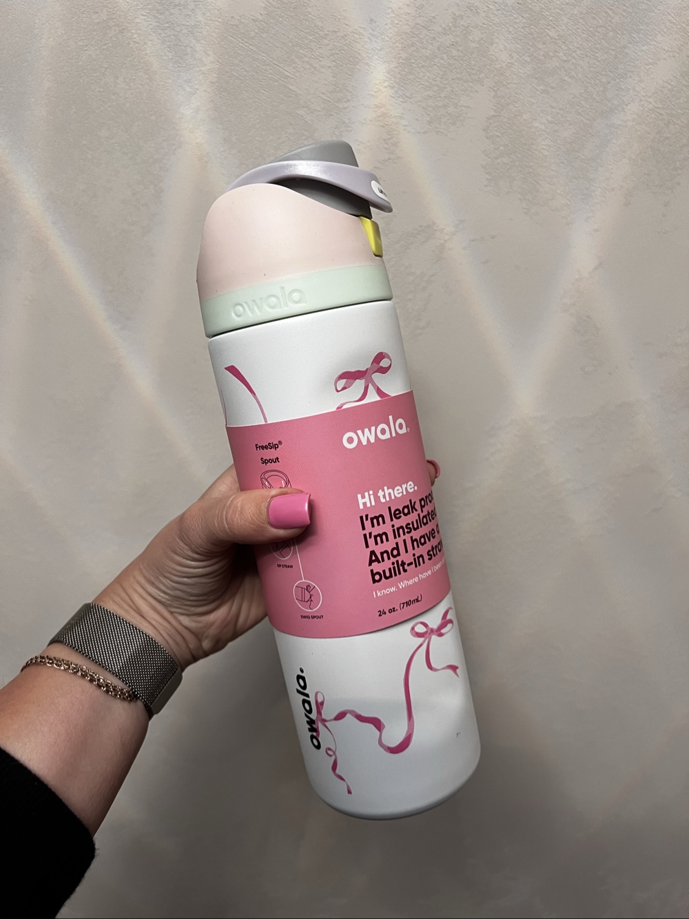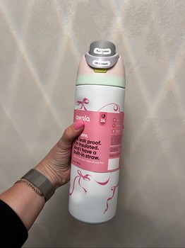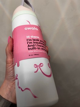 Owala Freesip insulated water bottle with bow design. Capacity 24 oz/710 ml.