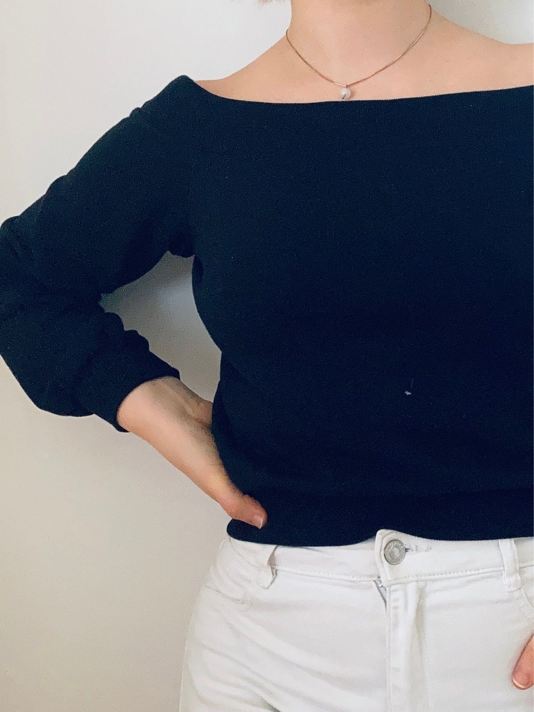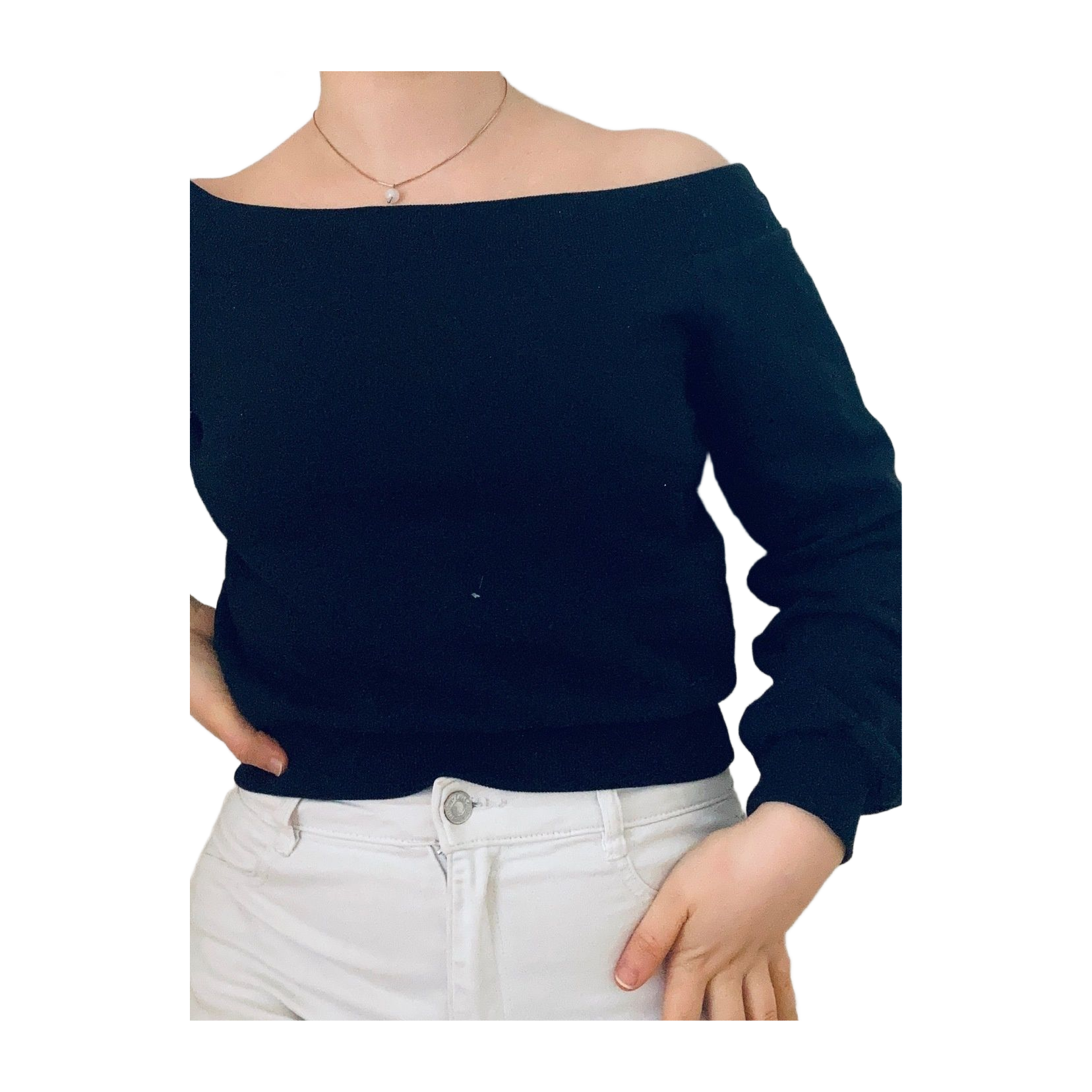 Black sweatshirt. Ribbing at the neckline, hem and cuffs. Wonderfully soft and warm! I myself am size S on top, I would say it fits XXS-S size. In the picture white loose lint etc. So it is completely neat and stain-free.