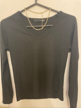 Black shirt with narrow ribbing. V-neckline. Size label M, but corresponds to size XS / small S. Tight on me at the shoulders. The belt in the picture is also for sale.