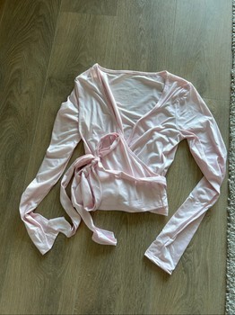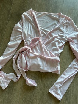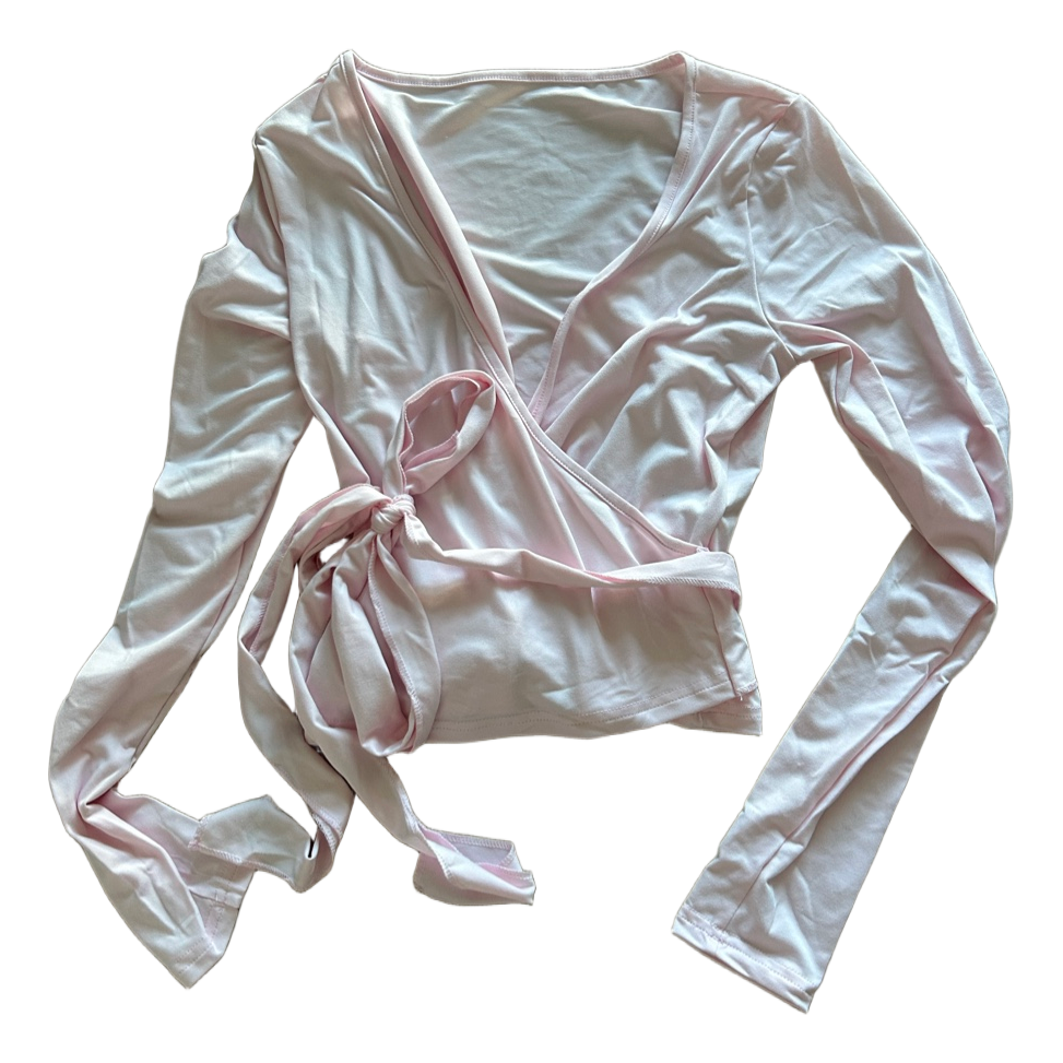 Long-sleeved pink wrap blouse with tieable ribbons.