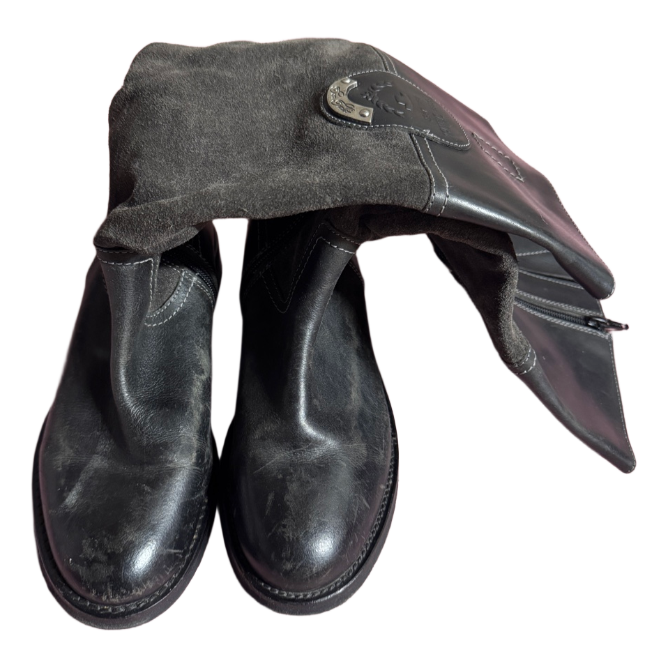 Black tall boots with suede uppers and leather foot sections. Featuring decorative metal detailing.