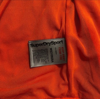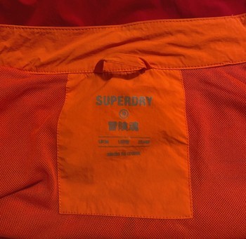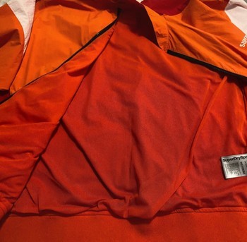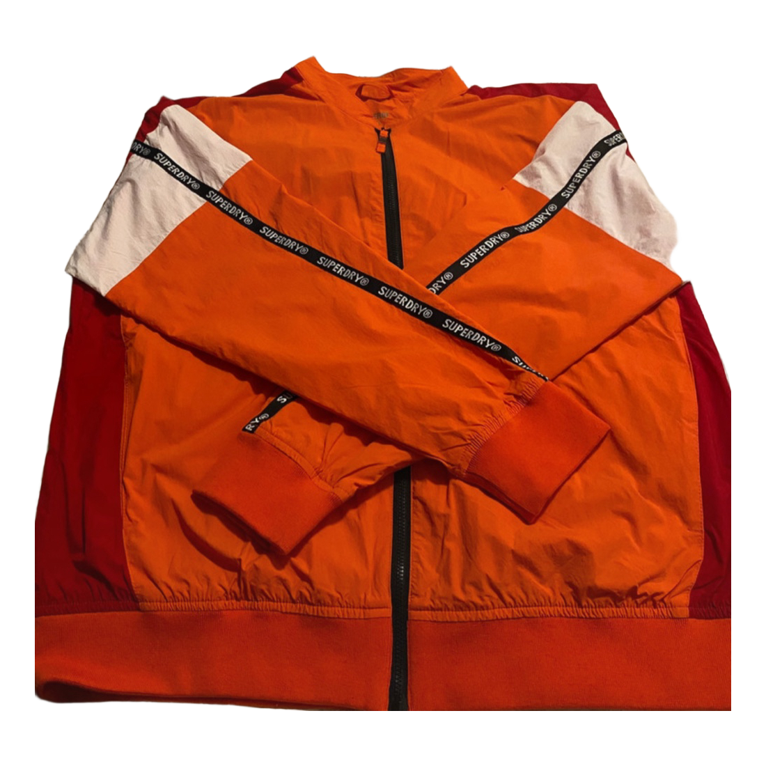 Orange zip-up sports jacket with white accents. Features branded taping on the sleeves and a mesh lining. Size L.