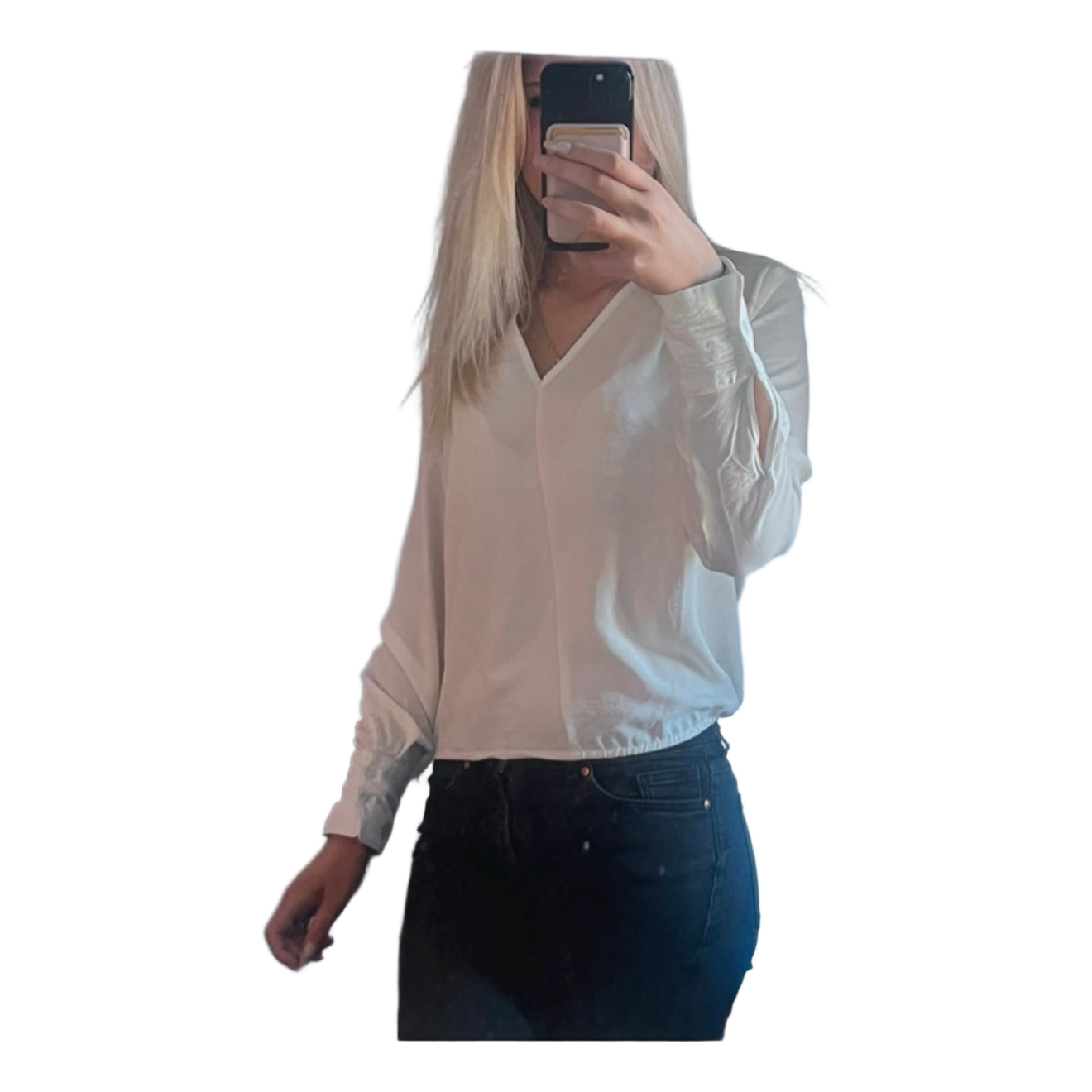 White long-sleeved shirt with V-neck.