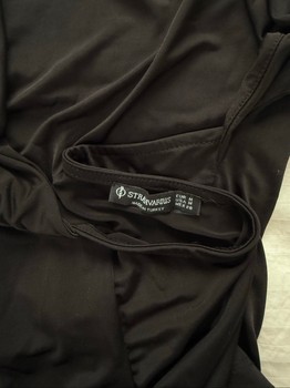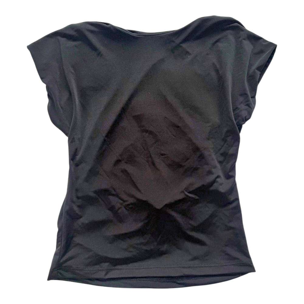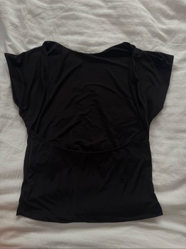 Black top with a draped open back design. The fabric appears soft and flowing.