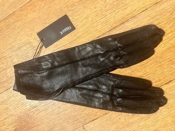 Black leather gloves with raw edge detail. Brand new with tags attached.