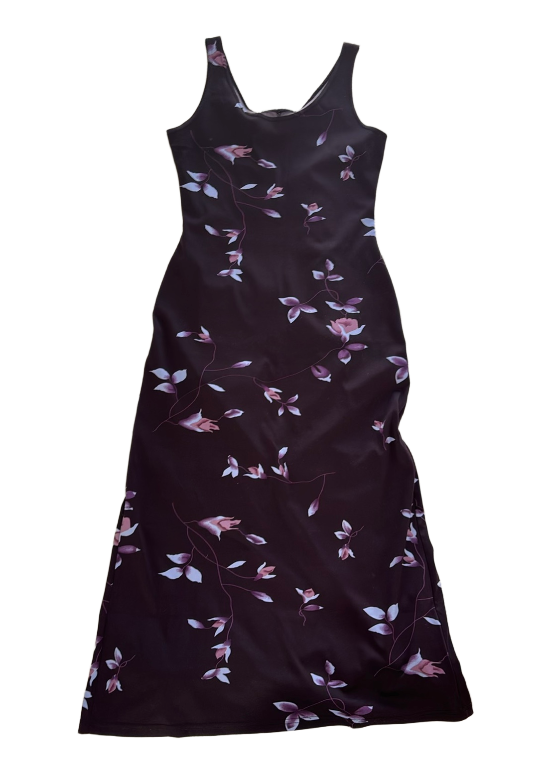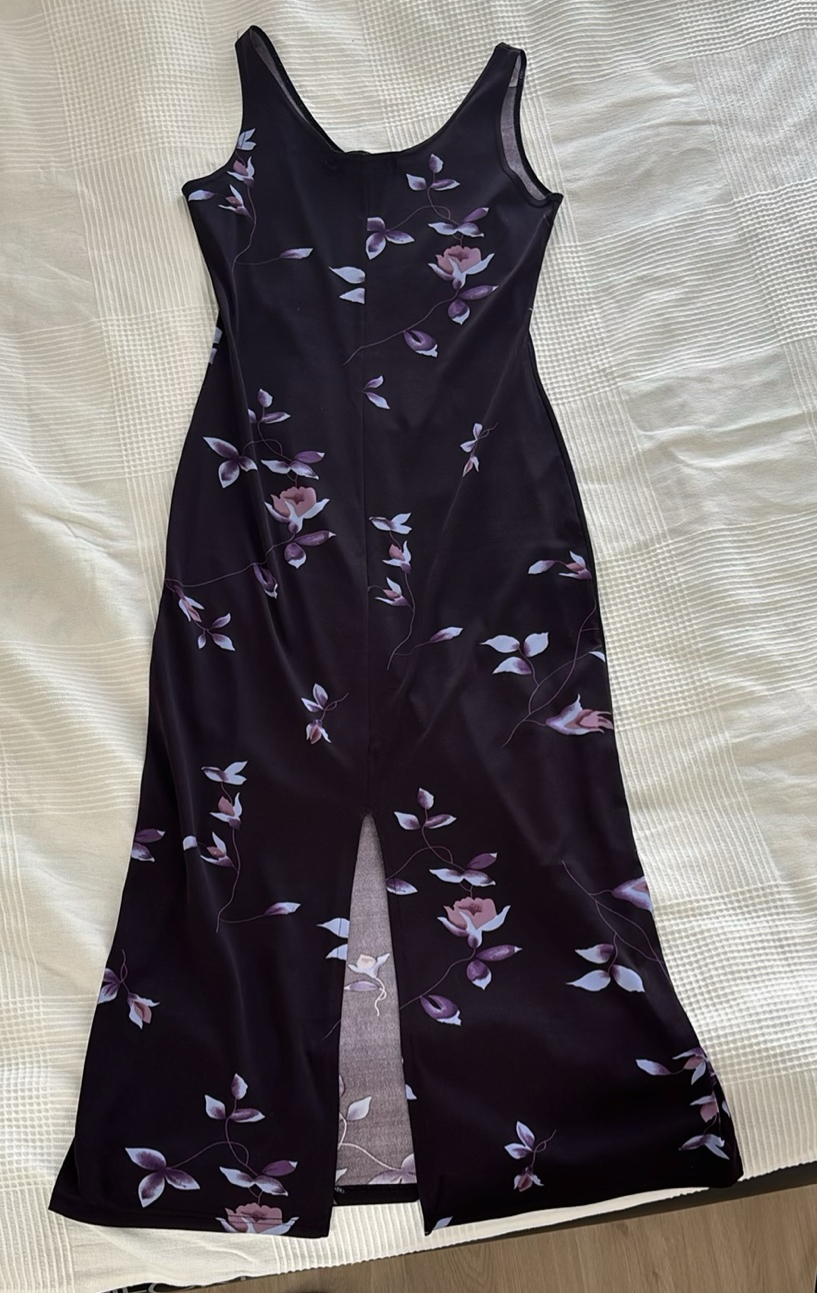 Black floral-patterned dress with a slit in the hem at the back