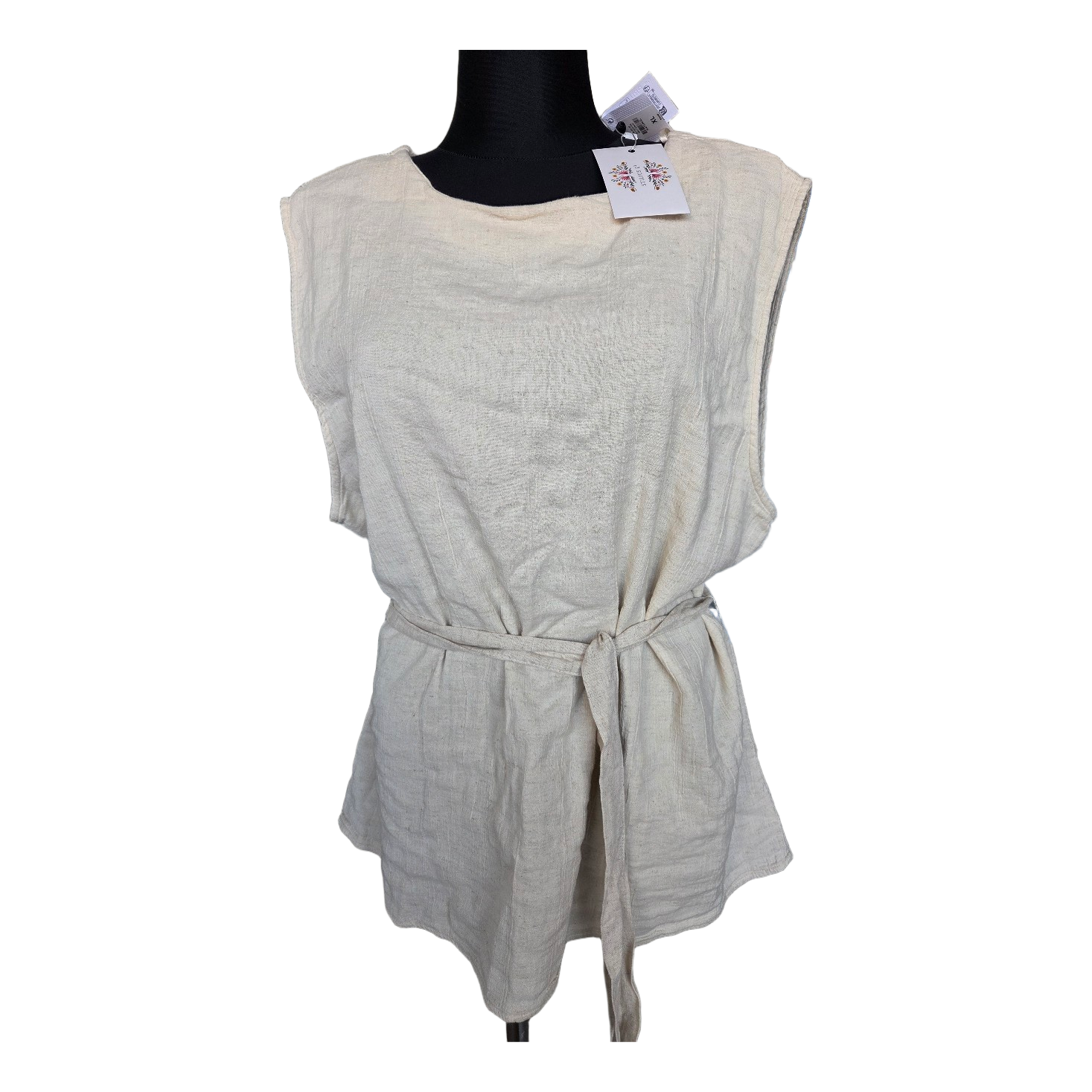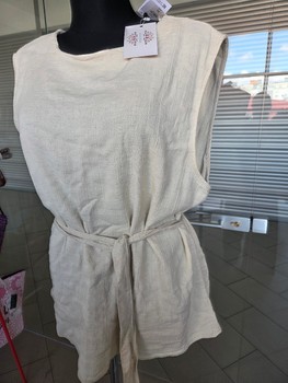 Beige sleeveless top with a waist tie belt. Featuring a button closure at the back. Size XL.