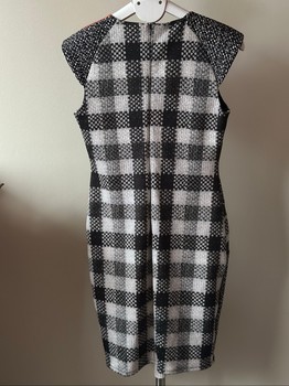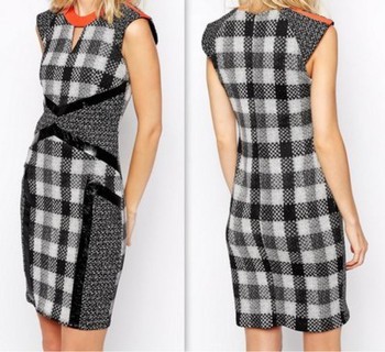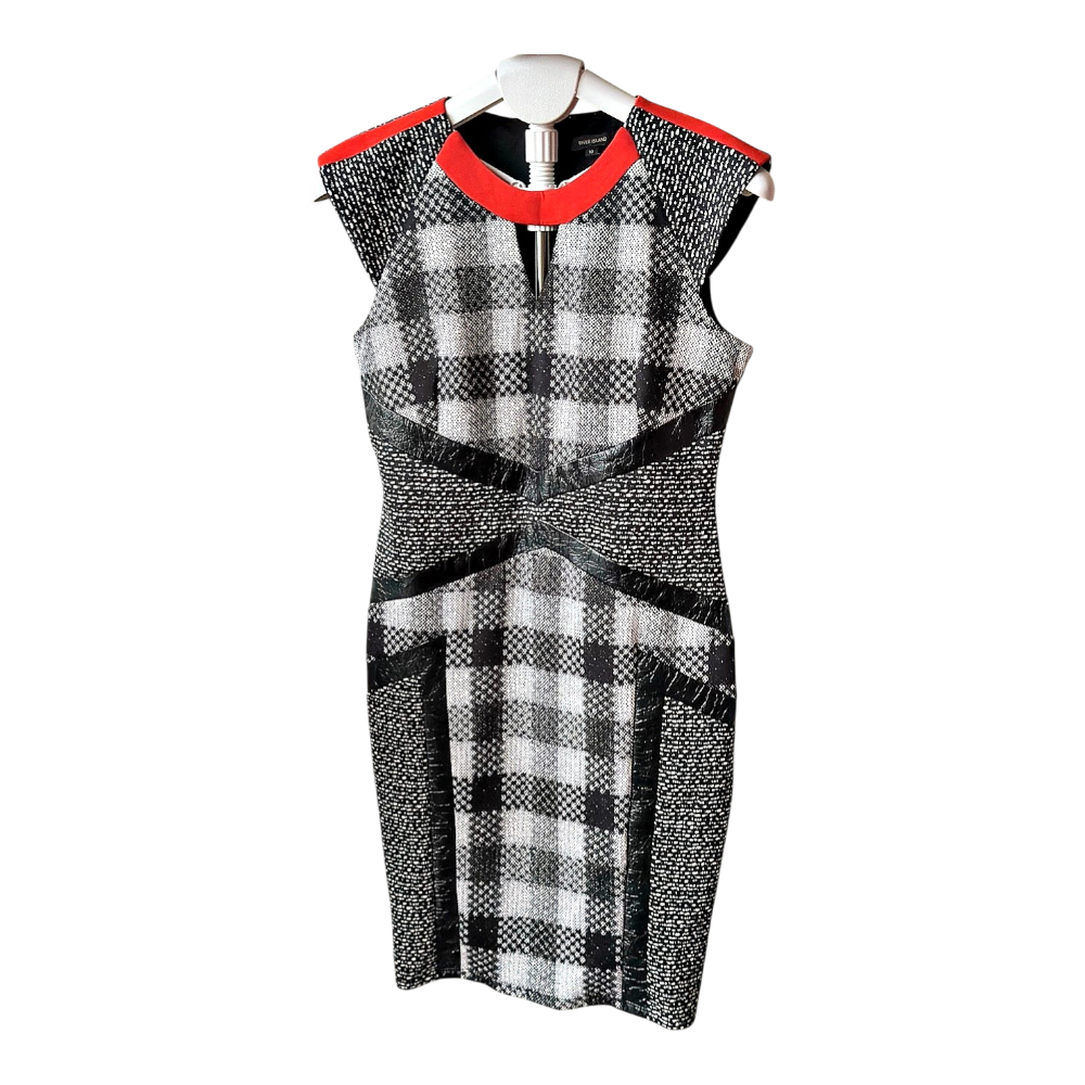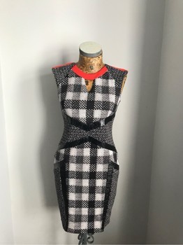 Bodycon dress with a black, white, and grey plaid pattern. Features black panel detailing on the sides and waist. Orange trim accentuates the neckline.