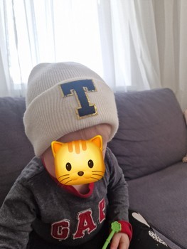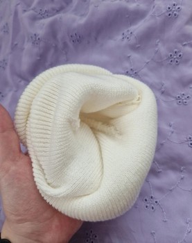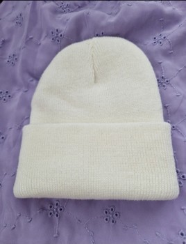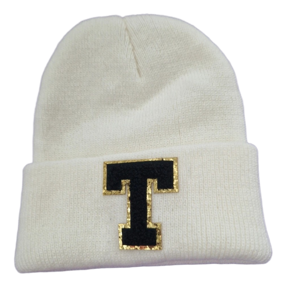 White ribbed knit beanie with a decorative letter T patch on the front.