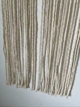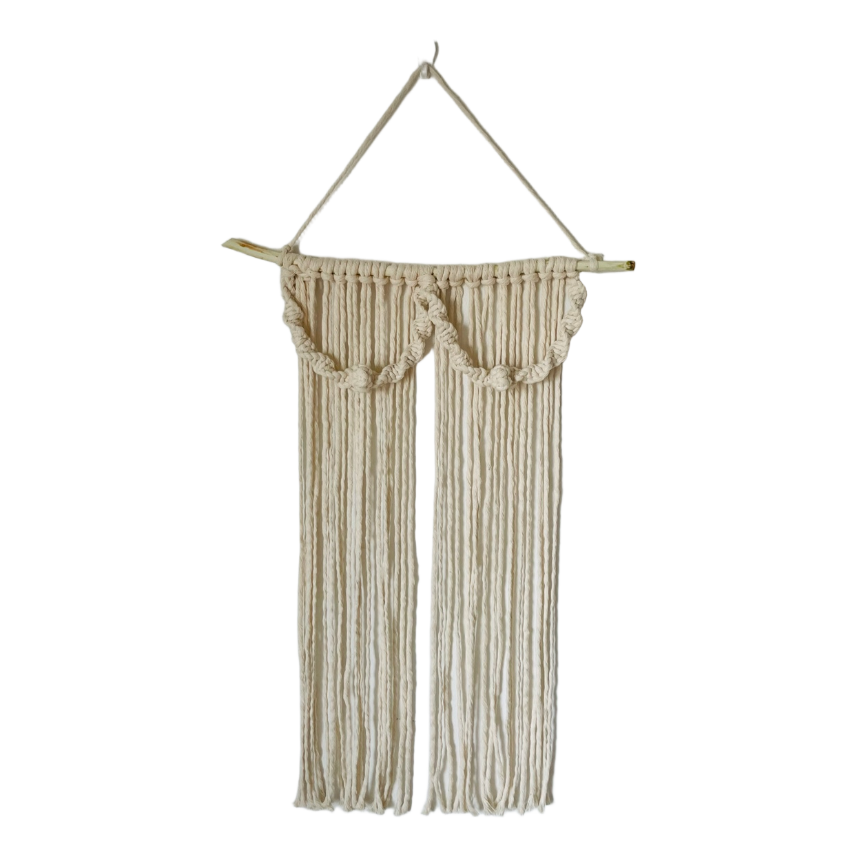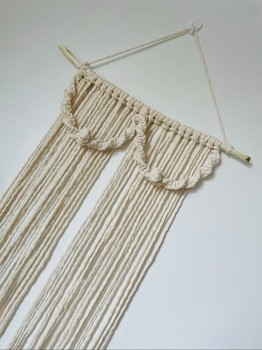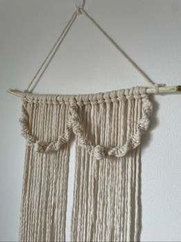 Hand-tied macrame wall hanging made on a carved natural wood branch. Color natural white. Cotton 80% polyester 20%. Width 37 cm. Height with hanging loop approx. 68 cm.