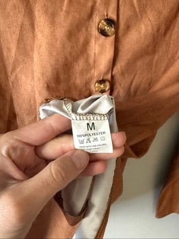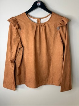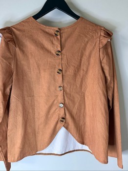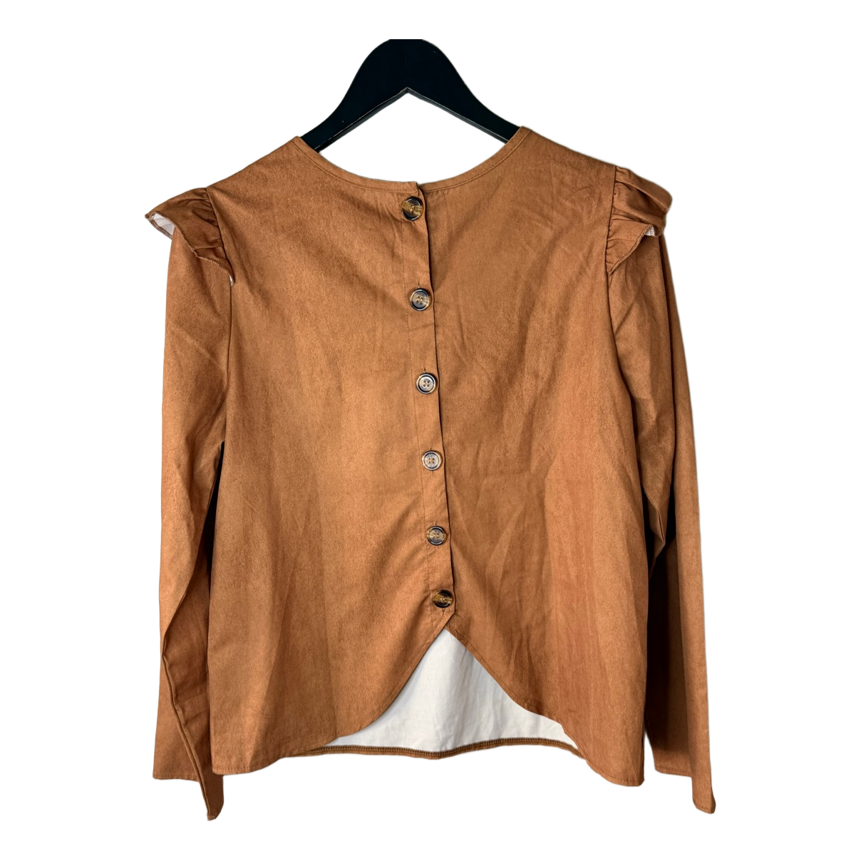 Brown blouse with button detail on the back and ruffled shoulder accents. Made of 100% polyester. Size M.