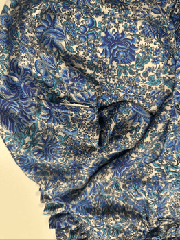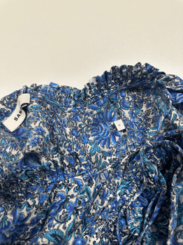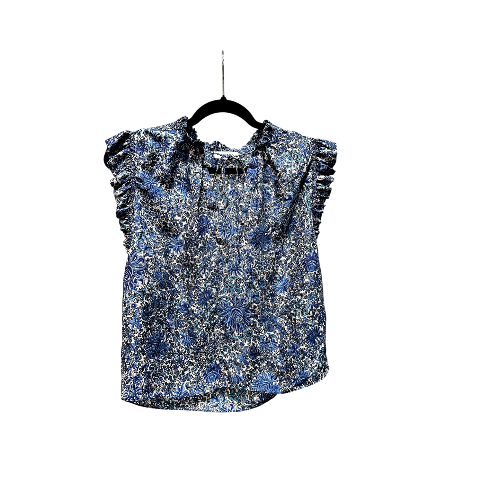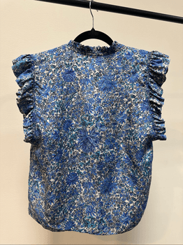 Short sleeve top with ruffled sleeves and a floral print in blue hues. Features a gathered neckline for added detail.