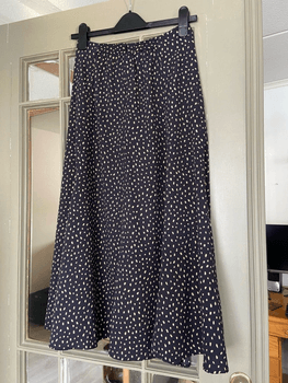 Maxiskirt with dot print by Japanese brand Lily Brown. Asymmetric dot pattern in beige on navy background. Very good condition. One size, partially elastic waist best fits size small.