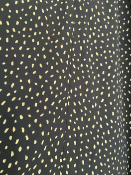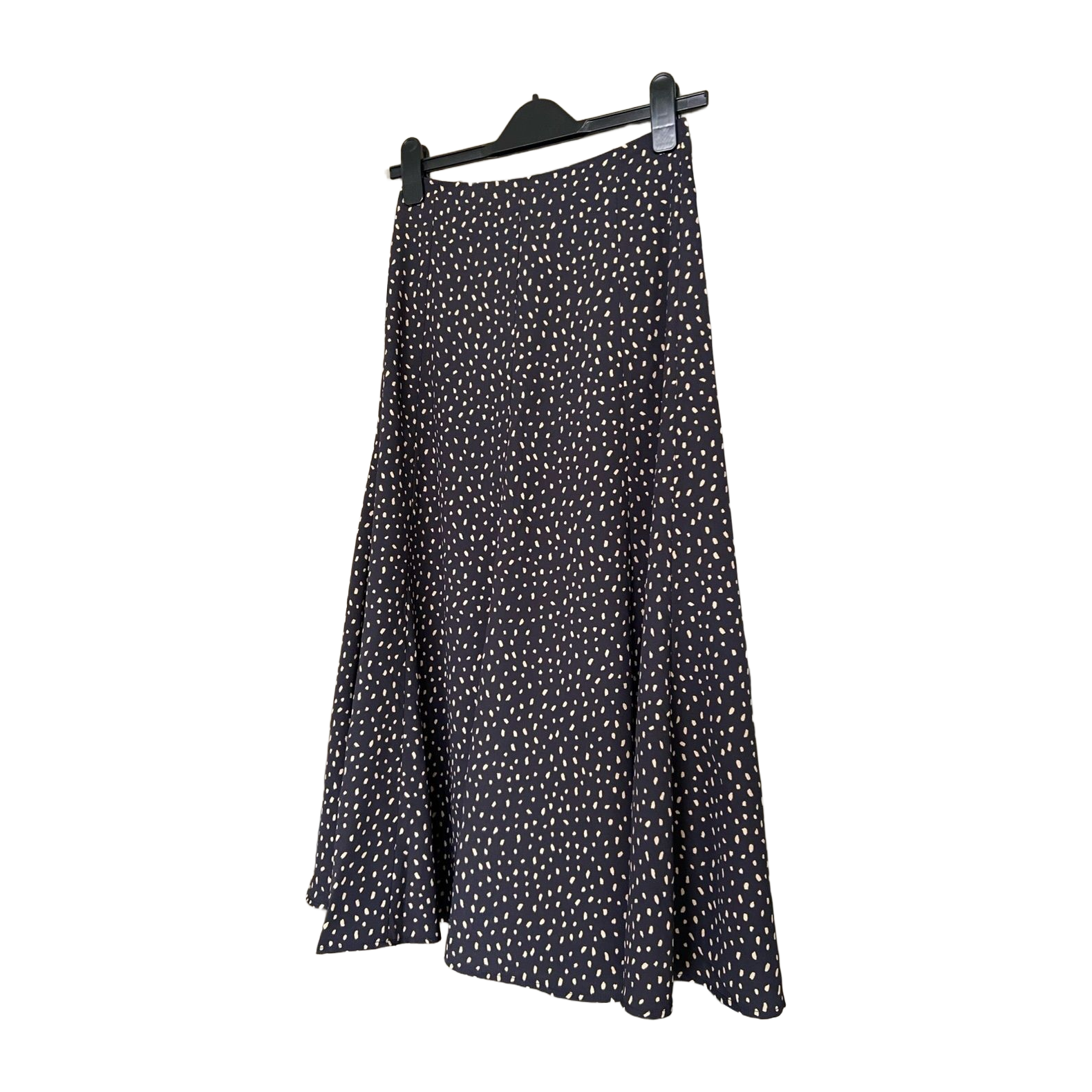 Japanilaisen Lily Brownin pilkullinen maksihame. Asymmetrinen, beige pilkkukuvio tummansinisellä taustalla. Hyväkuntoinen. Yhden koon, osittain venyvä vyötärö sopii parhaiten S-kokoiselle.