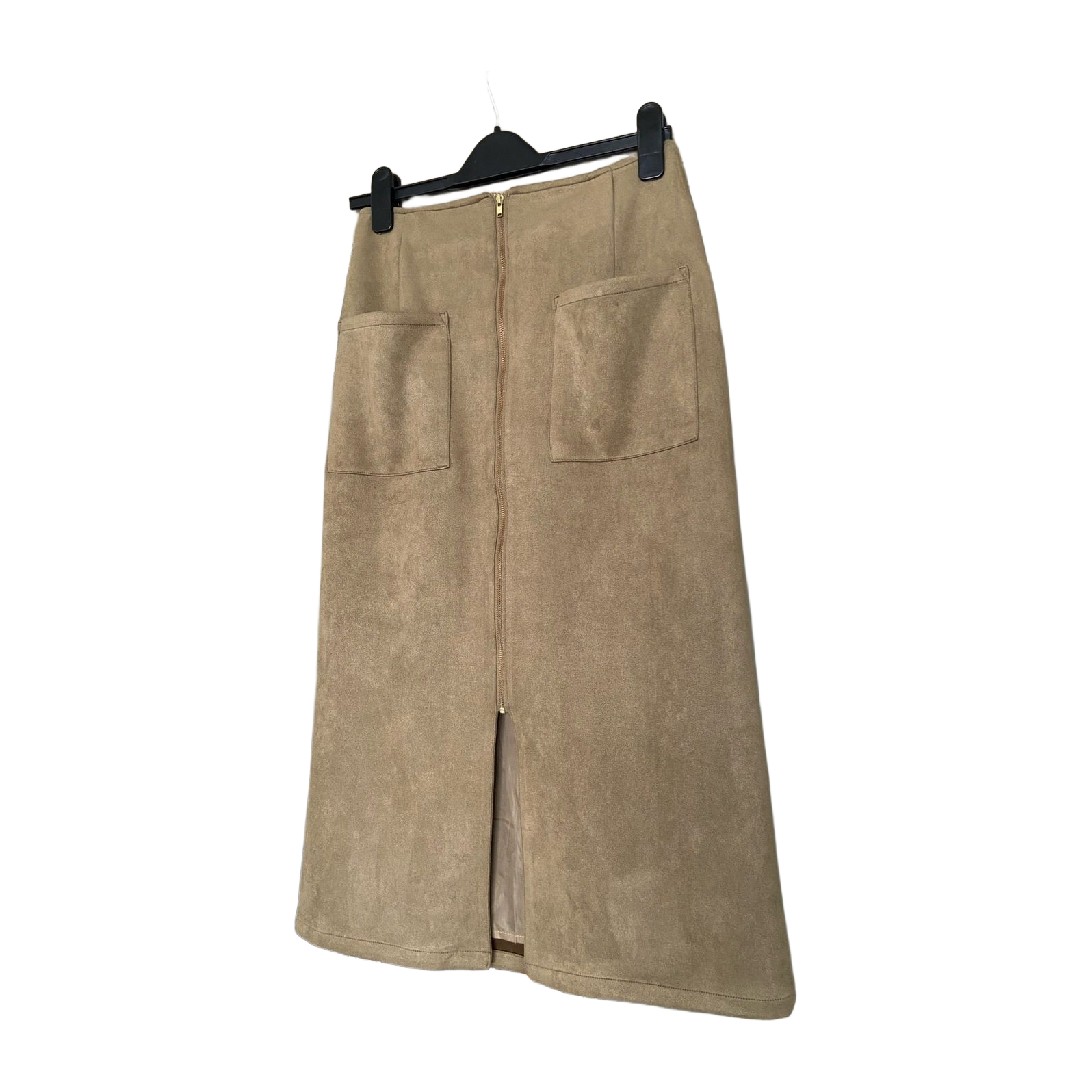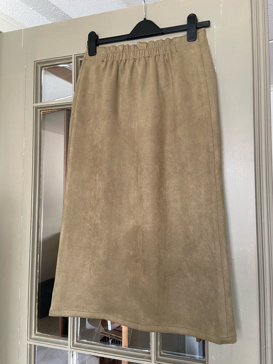 Khaki midi skirt in a faux suede material by Japanese brand Archives. Front pockets and a working front zipper. Very good condition. One size, partially elastic waist, best fits approximately size S–M.