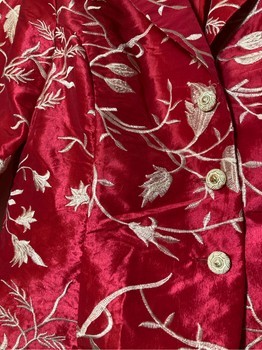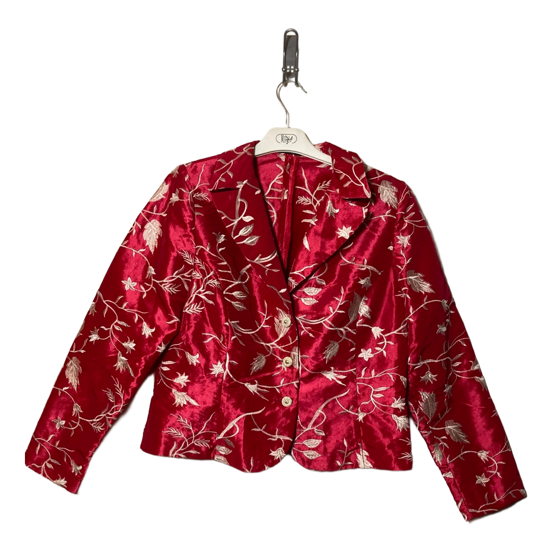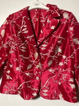 Santarelli luxurious red satin jacket. Cream-colored Jacquard-type sewn pattern. Jacket collar and V-neckline. Gold-colored buttons. Set-in sleeves. Slight padding at the shoulders. Excellent condition. Festive and shiny fabric. 50% polyester and 50% polyamide. Size 38. Shoulder width about 40 cm. Armpit-to-armpit measurement about 51 cm. Length about 56.5 cm. Sleeve length from armpit about 40 cm.
