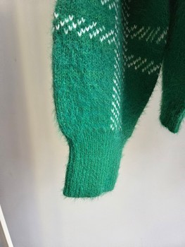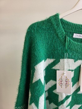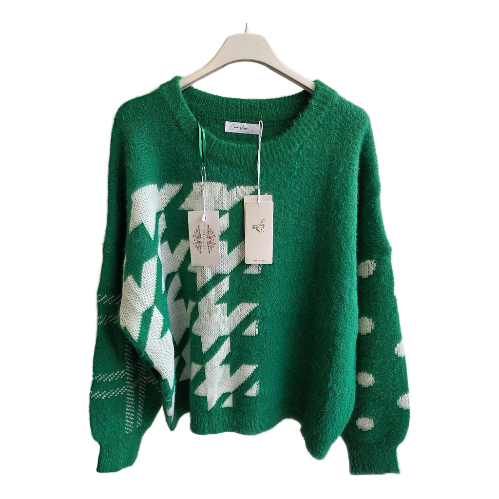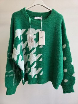 Green sweater with white houndstooth pattern. Size TU. Made of acrylic, viscose, wool, and elastane blend.