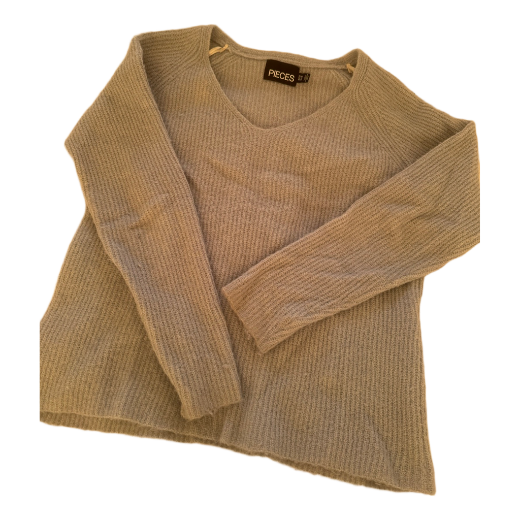 Vaaleansininen neulepaita, jossa on V-kaula-aukko. Koko XS.