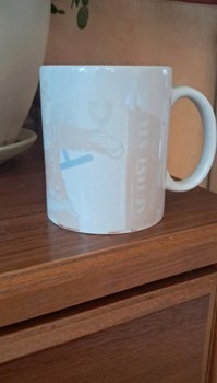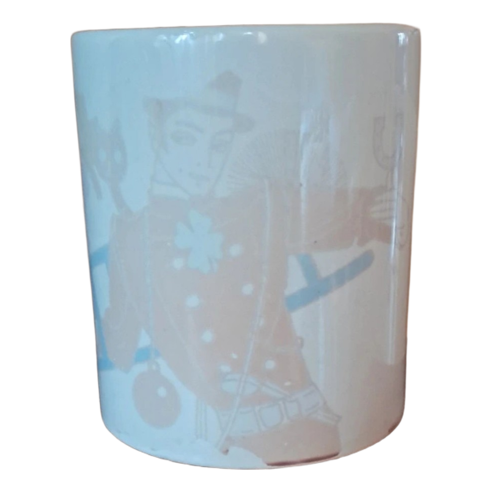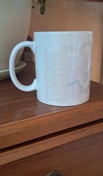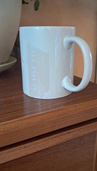 White ceramic mug featuring a light-toned illustration of a person on the front.