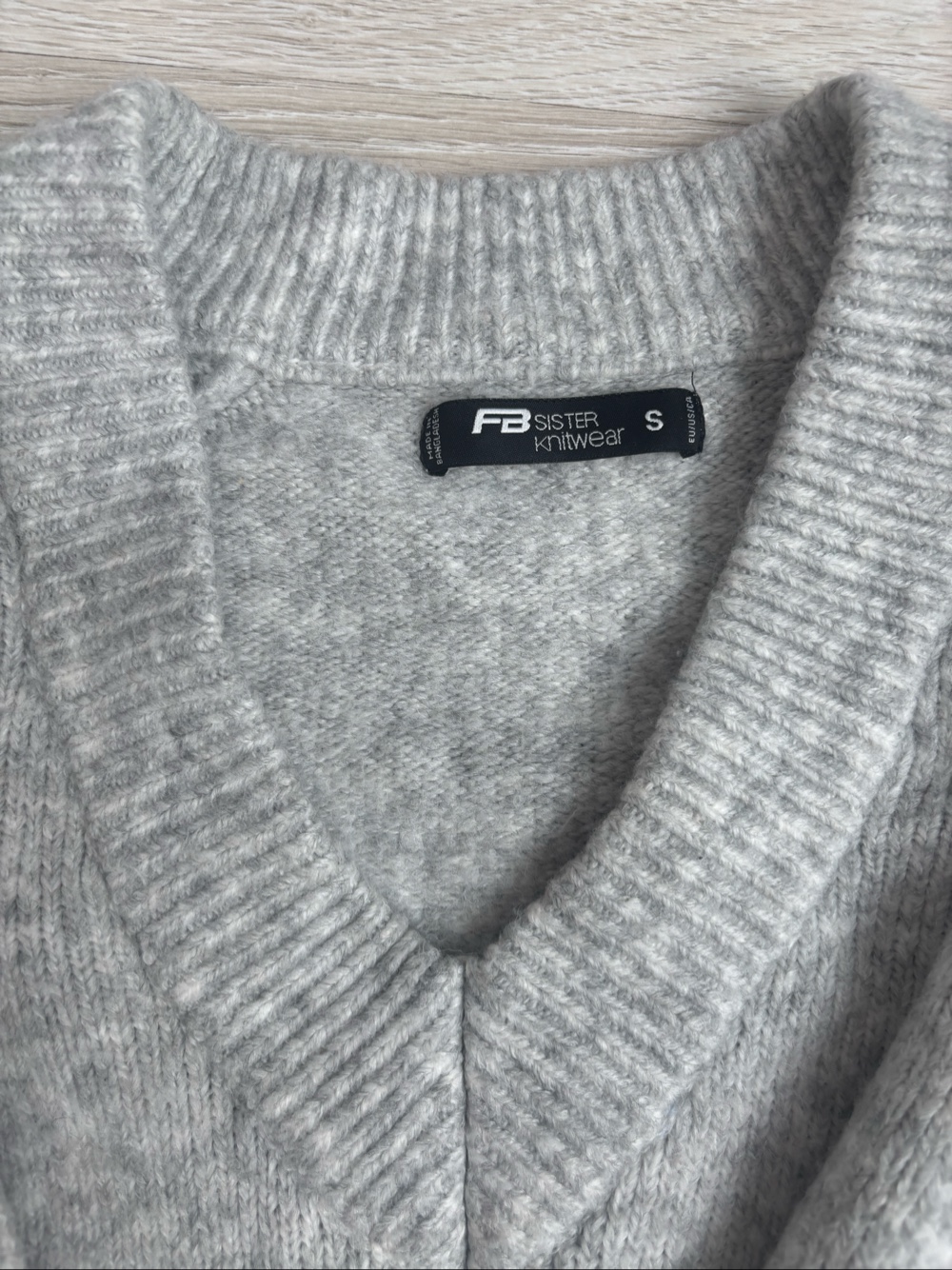 FB's grey wool sweater. Thick and very warm with V-neck at the front. Size S and fits well also M. RRP: €20