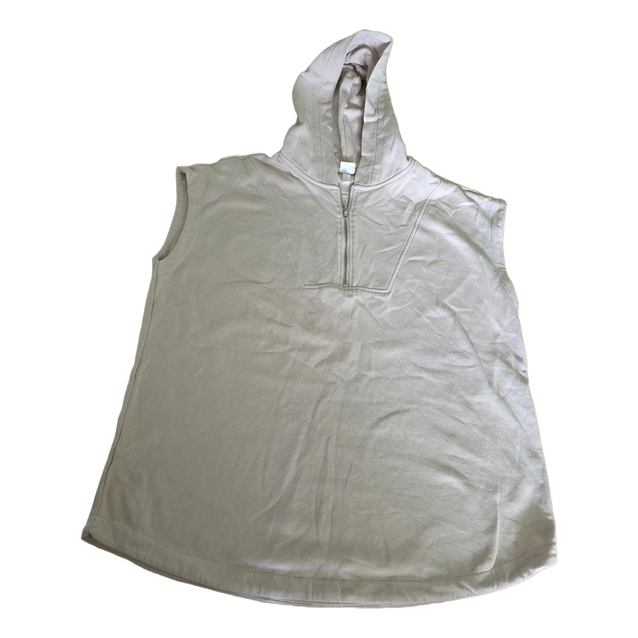 Sleeveless sand-colored top with hood and half-zip neckline.