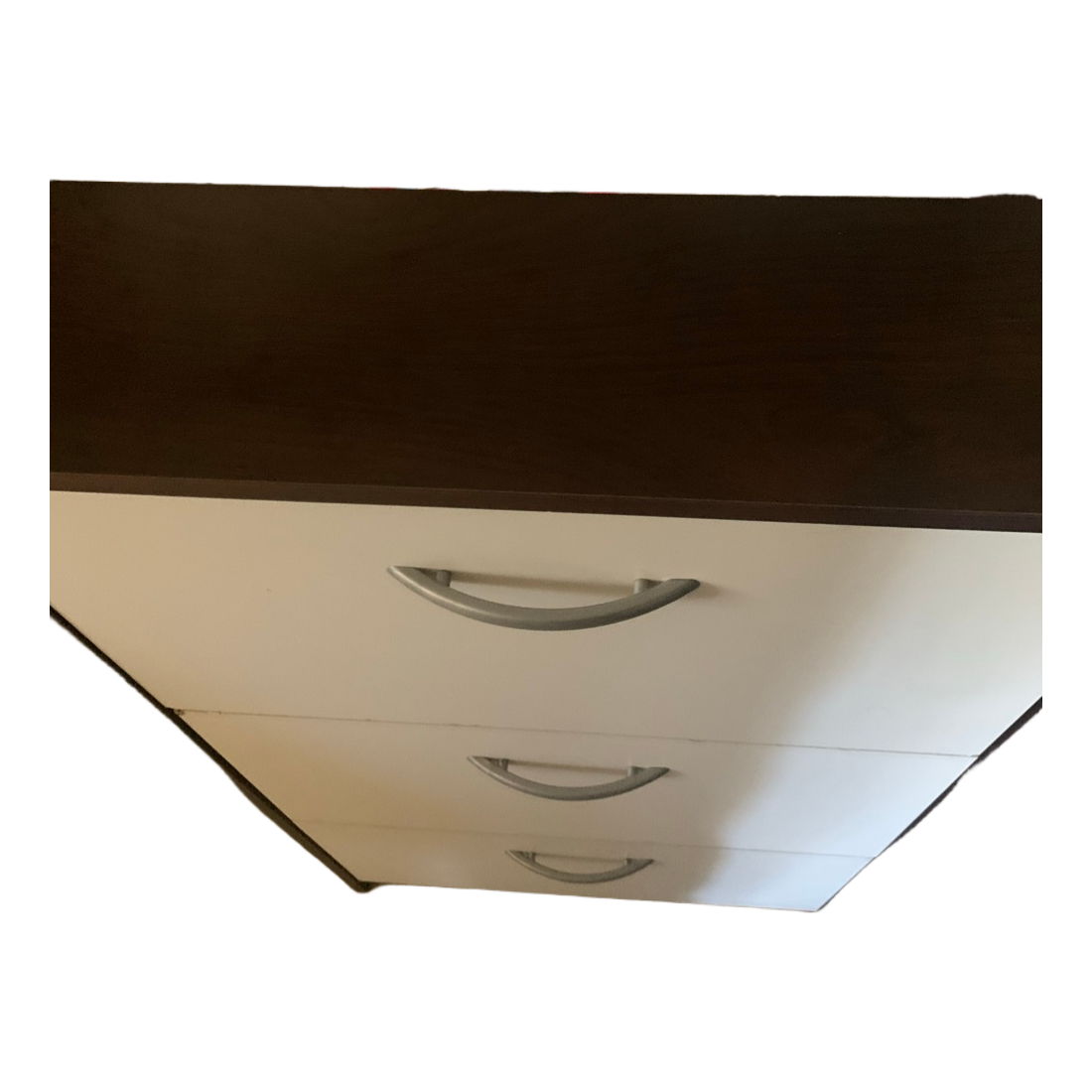 Three-compartment white shoe cabinet with a brown top surface. Equipped with silver-colored handles.