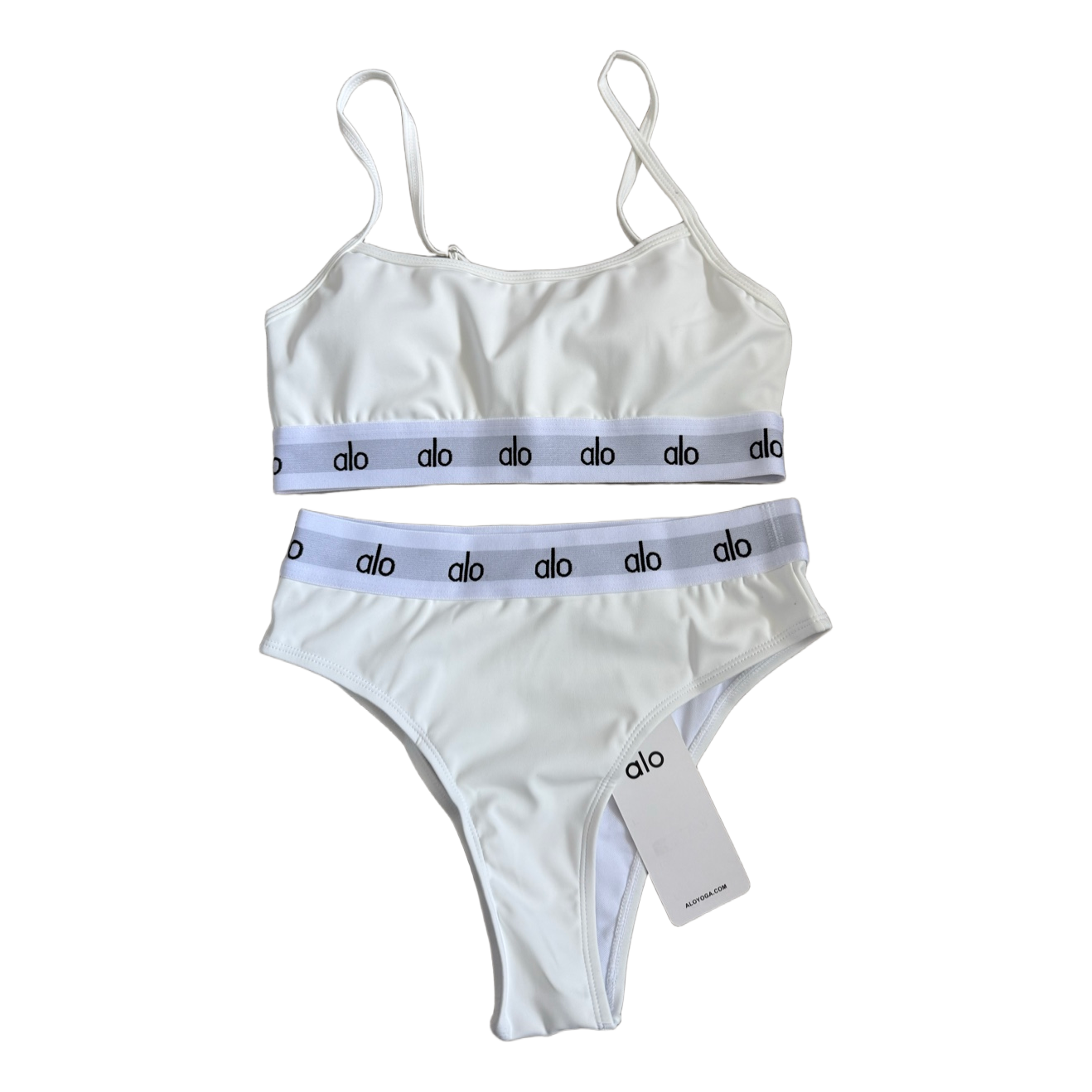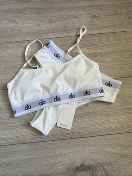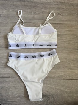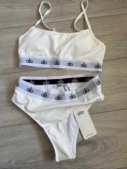Two-piece bikini set in white featuring branded elastic bands. Size S.