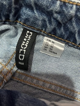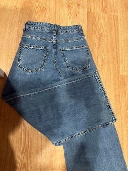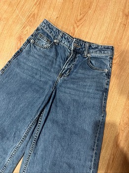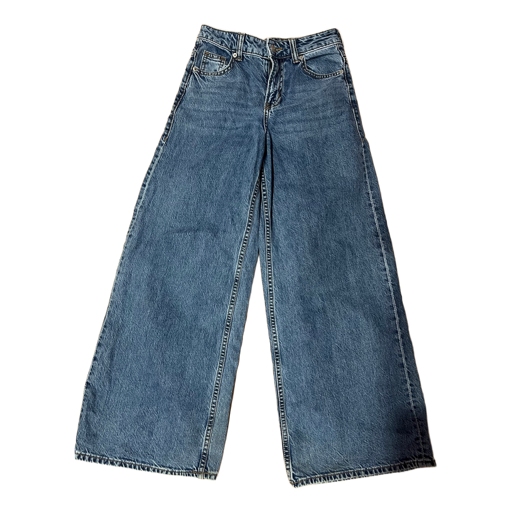 Blue denim jeans with a wide leg fit. Feature a high-waisted design with classic five-pocket styling. Size 30.