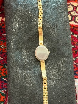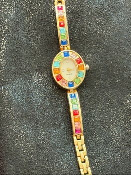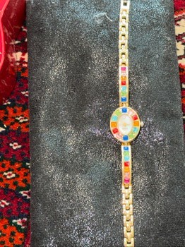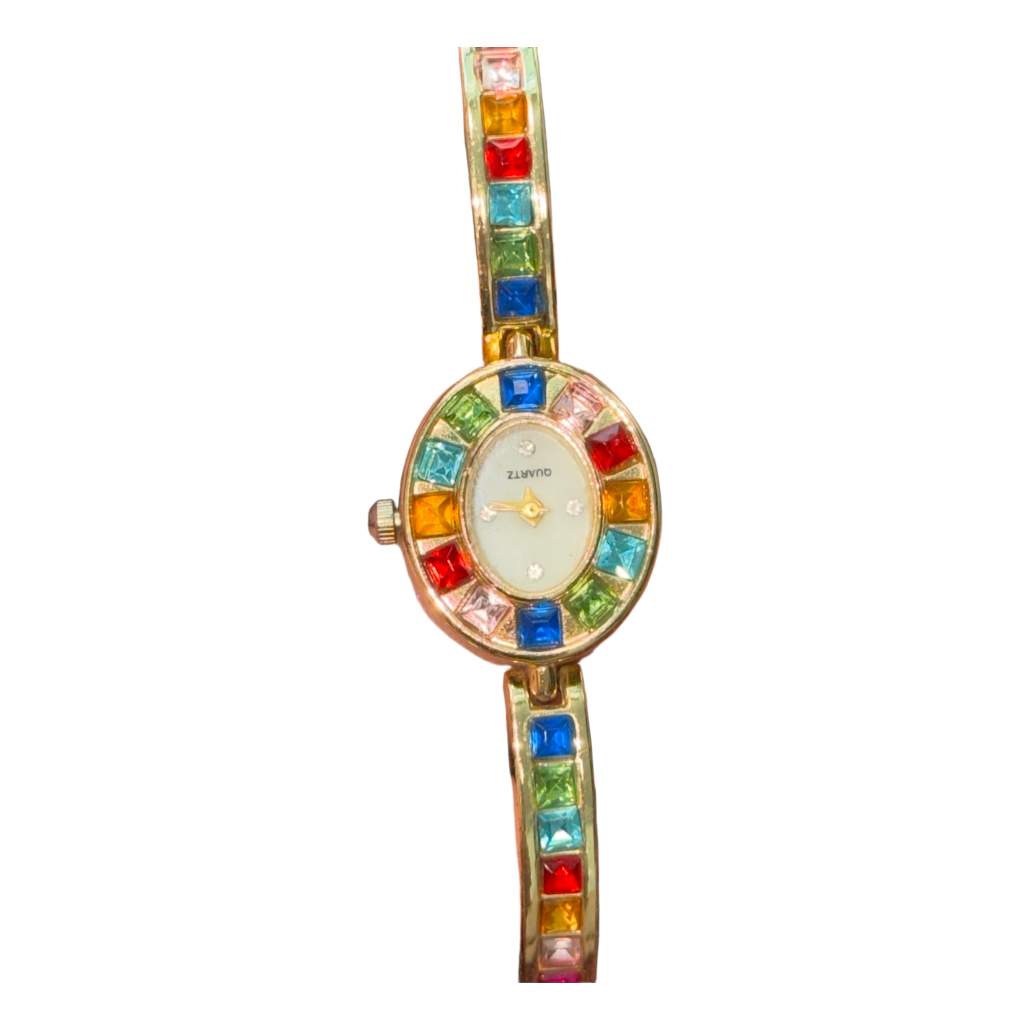 Quartz watch with a gold tone finish and multicolored decorative crystals around the face and on the strap.