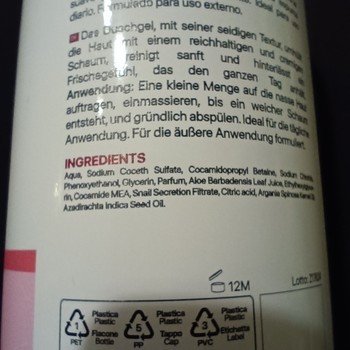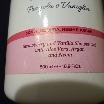 Shower gel with strawberry and vanilla scent, enriched with aloe vera, argan, and neem oil. 500 ml bottle.