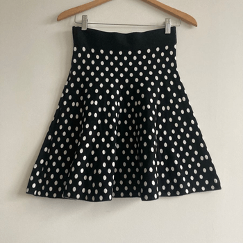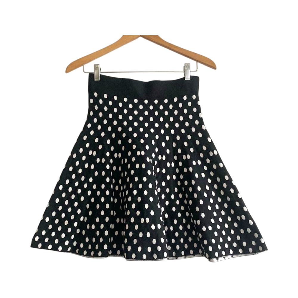 Beautiful black-and-white polka dot knit skirt by Maeve (Anthropologie). Made from a high-quality, thicker cotton–nylon blend that keeps its shape and creates a flattering circle silhouette. High-waisted, feminine and playful — perfect for everyday wear, office looks or dressing up. Excellent condition.