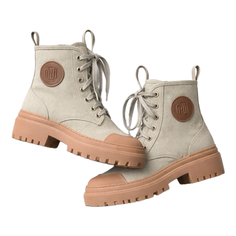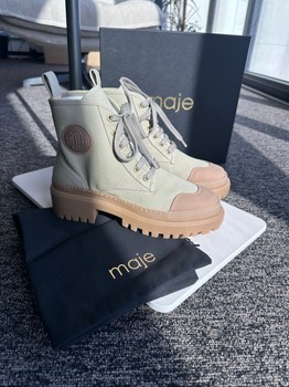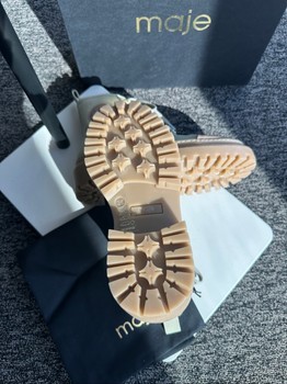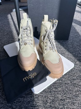 Beige lace-up ankle boots with thick rubber soles. Features the Maje logo patch on the side. Size 36.